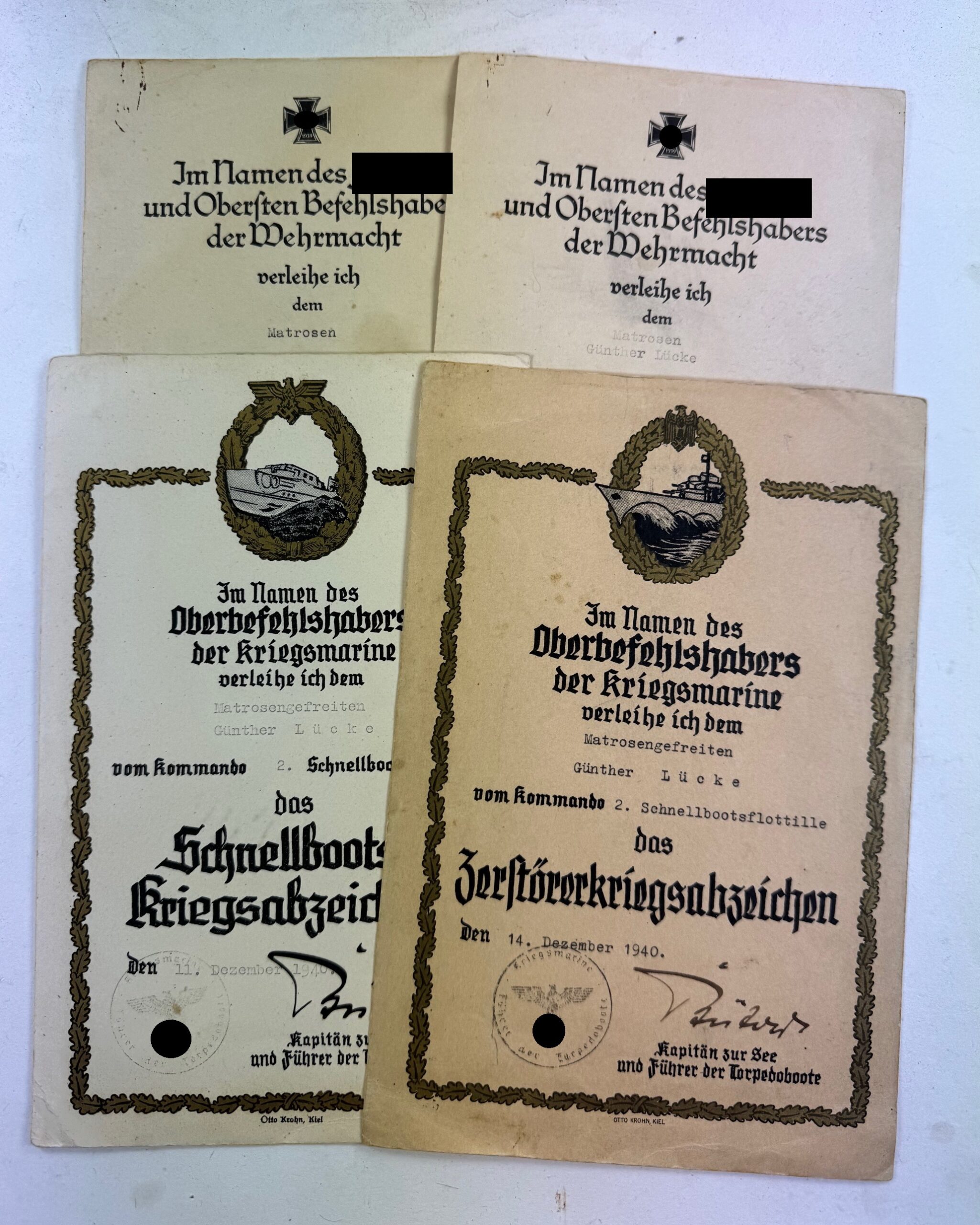Urkunden Nachlass des matrosen Günther Lücke. Alle Urkunden in einen sehr guten, nur leicht gebrauchten Zustand. Er diente in der 2. Schnellbootsflottille.