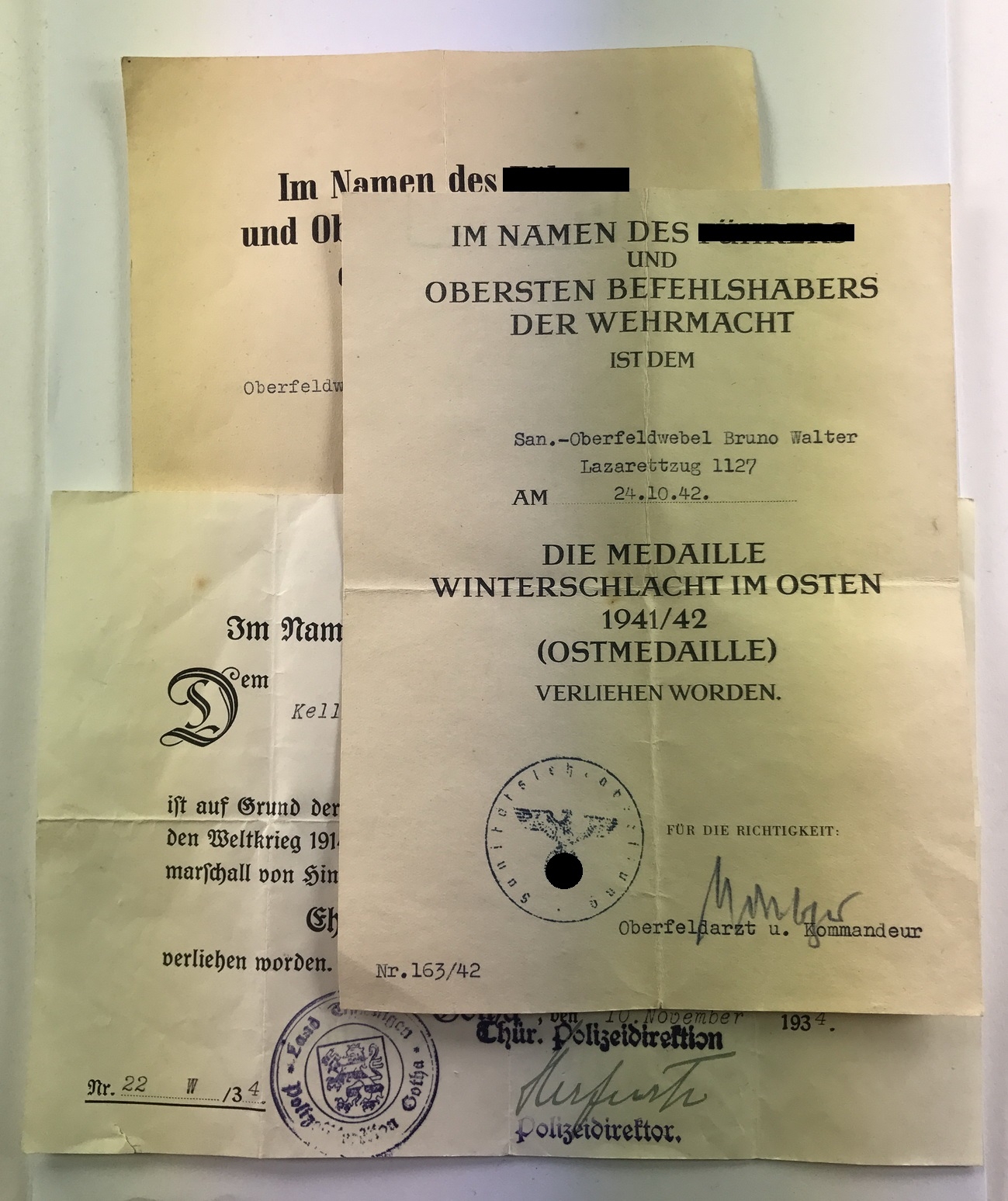 A small document group belonging to the Sanitätsoberfeldwebel Bruon Walter. Comprised of documents for: