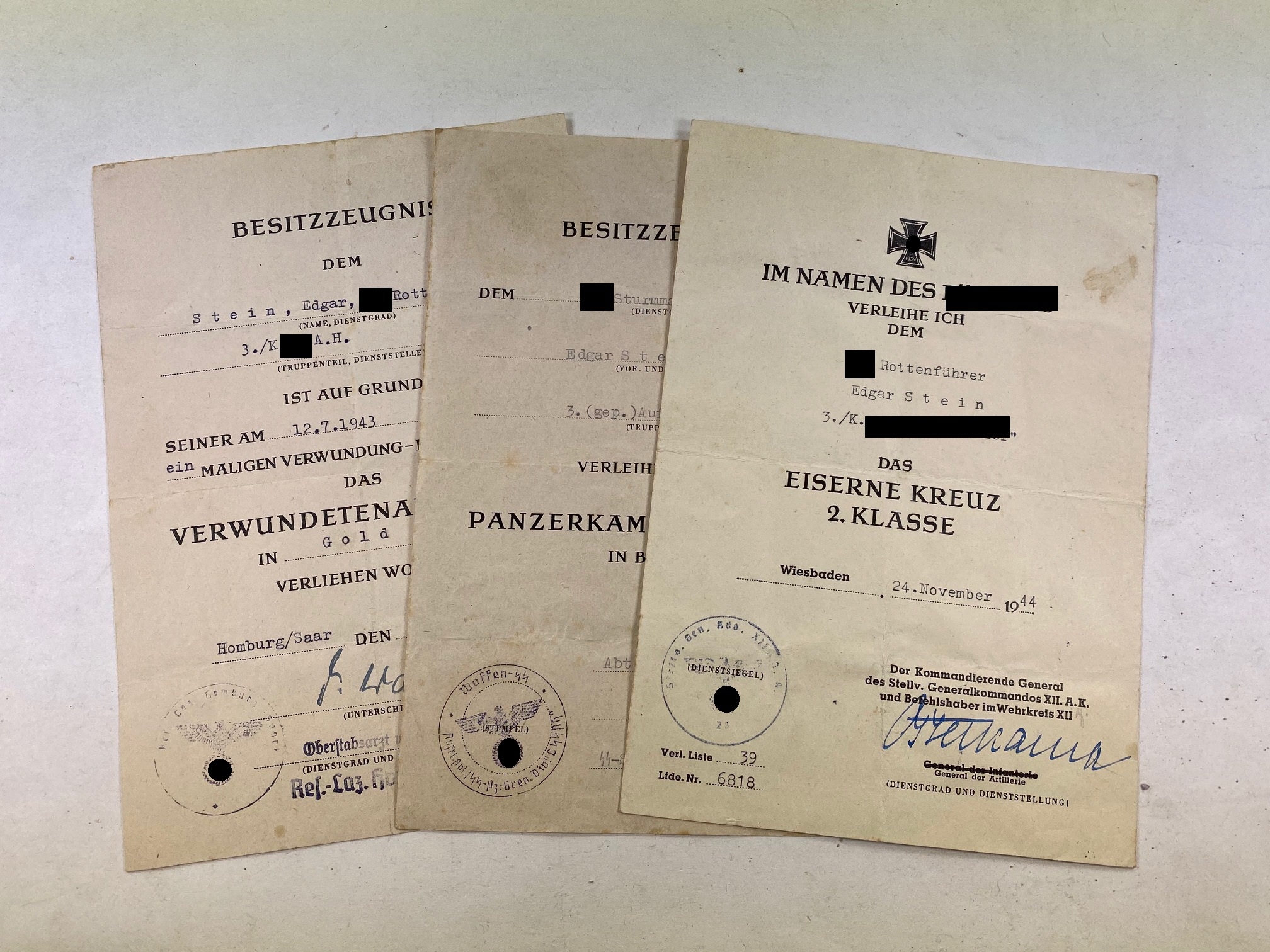 A group of documents from the possessions of the SS Rottenführers Edgar Stein. Stein served with the armoured reconaissence of the Leibstandarte. All the documents in a good, slightly used condition. Comprised of documents for: