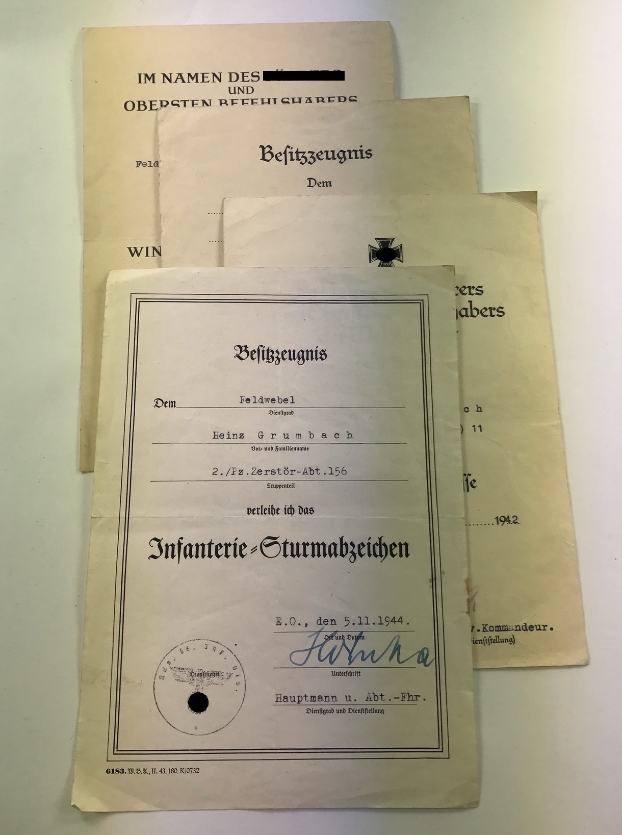 A group of documents for the Feldwebel Heinz Grumbach. All in a very good, slightly used condition. Comprised of: