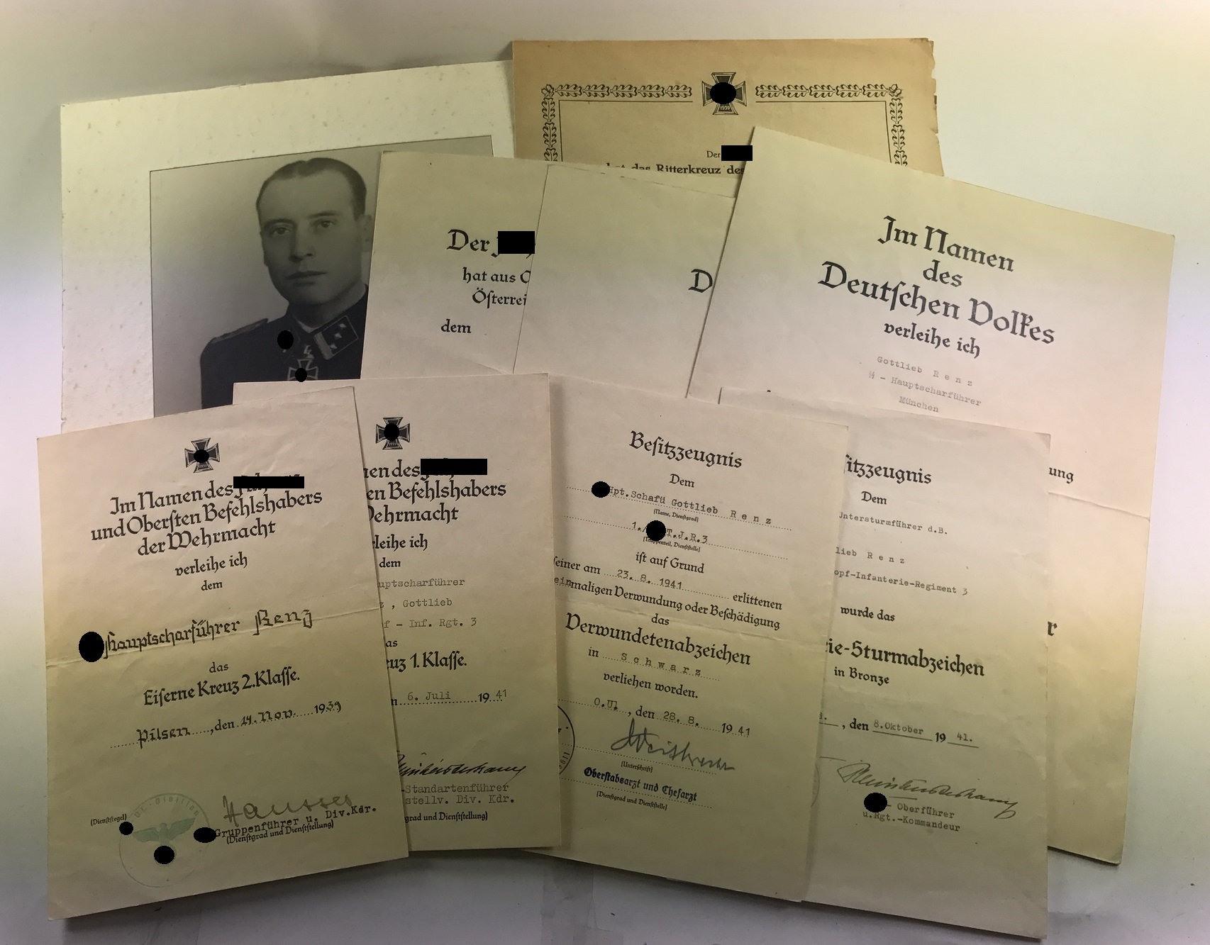 Gottlieb Renz, geboren am 12.9.1911 in Pfullingen/Reutlingen. SS Nummer 60.784, letzter bekannte Dienstgrad SS-Hauptsturmführer der Reserve. Ritterkreuz verliehen am 12.8.1944 für seinen tapferen und entscheidenden Einsatz bei den Abwehrkämpfen an der finnischen Front gegen die einbrechenden Sowjets. Von November 1944 bis Januar 1945 war er Kommandeur des SS-Schützen-Bataillons (Mot.) 6 „Nord“. gefallen am 3.1.1945 im Elsaß. Die Gruppe besteht aus: