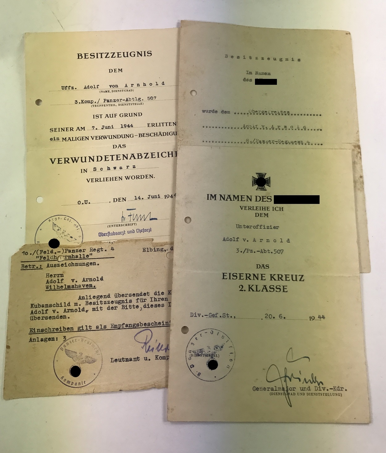 Urkunden Nachlaß des Unteroffiziers Adolf von Arnold. Der Unteroffizier dienten in der Schweren Panzer-Abteilung 507. Die Abteilung war mit Tiger I Panzern ausgerüstet. – Besitzzeugnis Verwundetenabzeichen in Schwarz – Urkunde Eisernes Kreuz 2. Klasse, original Unterschrift – Übersendungsschreiben Kuban Schild mit Urkunde – Besitzzeugnis Kuban Schild Extrem seltene Urkunden Gruppe einer Tiger Abteilung!