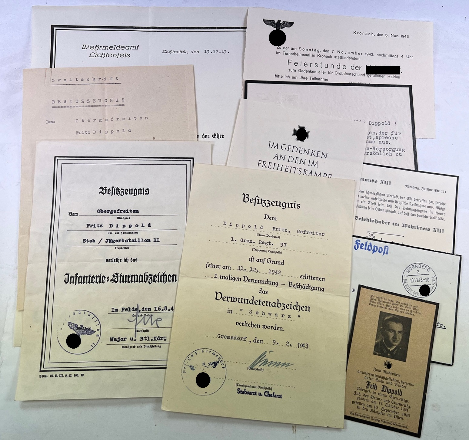 A group of documents from the possessions of the Obergefreiten Fritz Dippold.