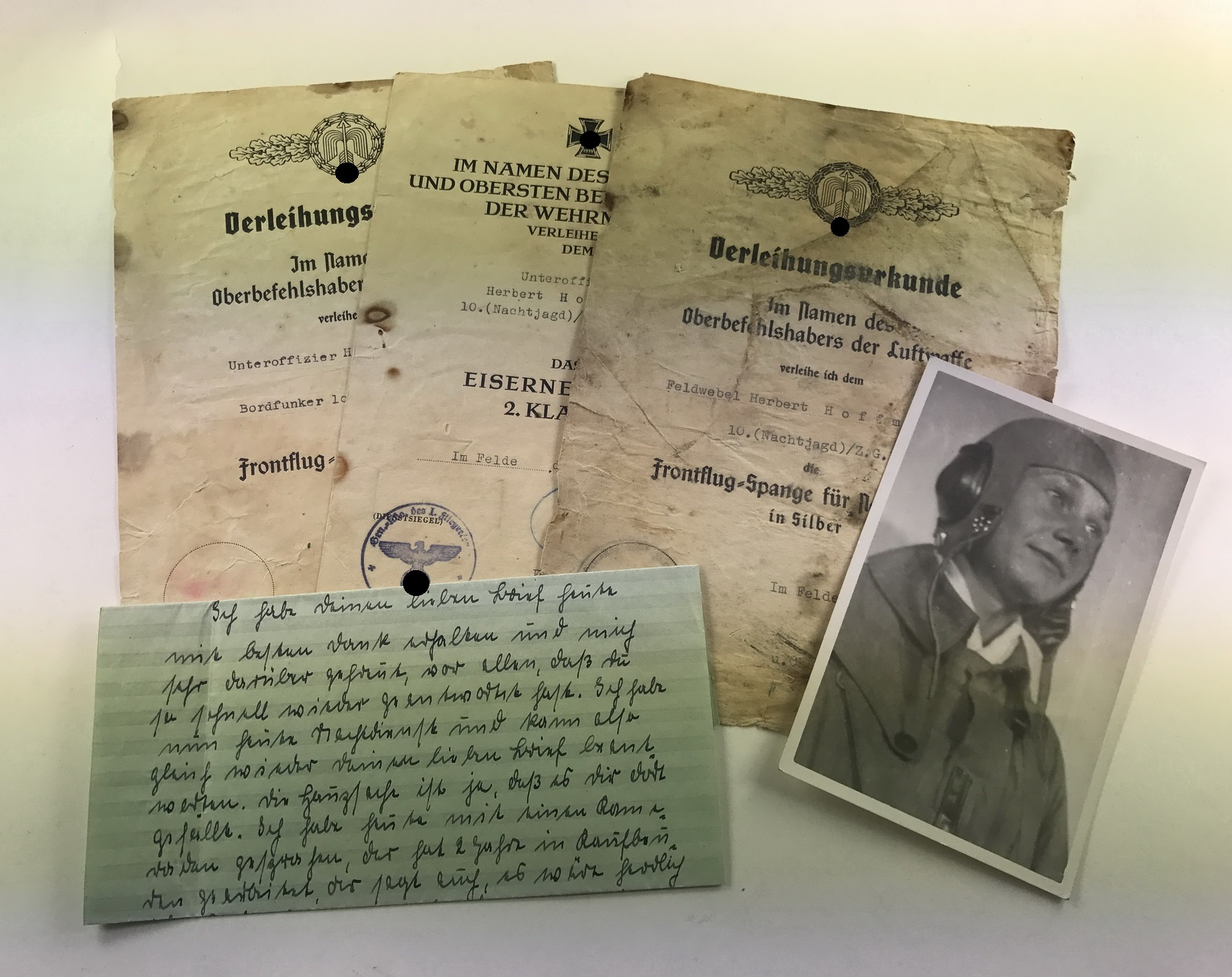 Urkunden des Feldwebels Herbert Hoffmann. Feldwebel Hoffmann diente als Bordfunker Nachtjagd Zerstörergeschwader 1. Die Urkunden befinden sich alle in einen stärker genrauchten Zustand.