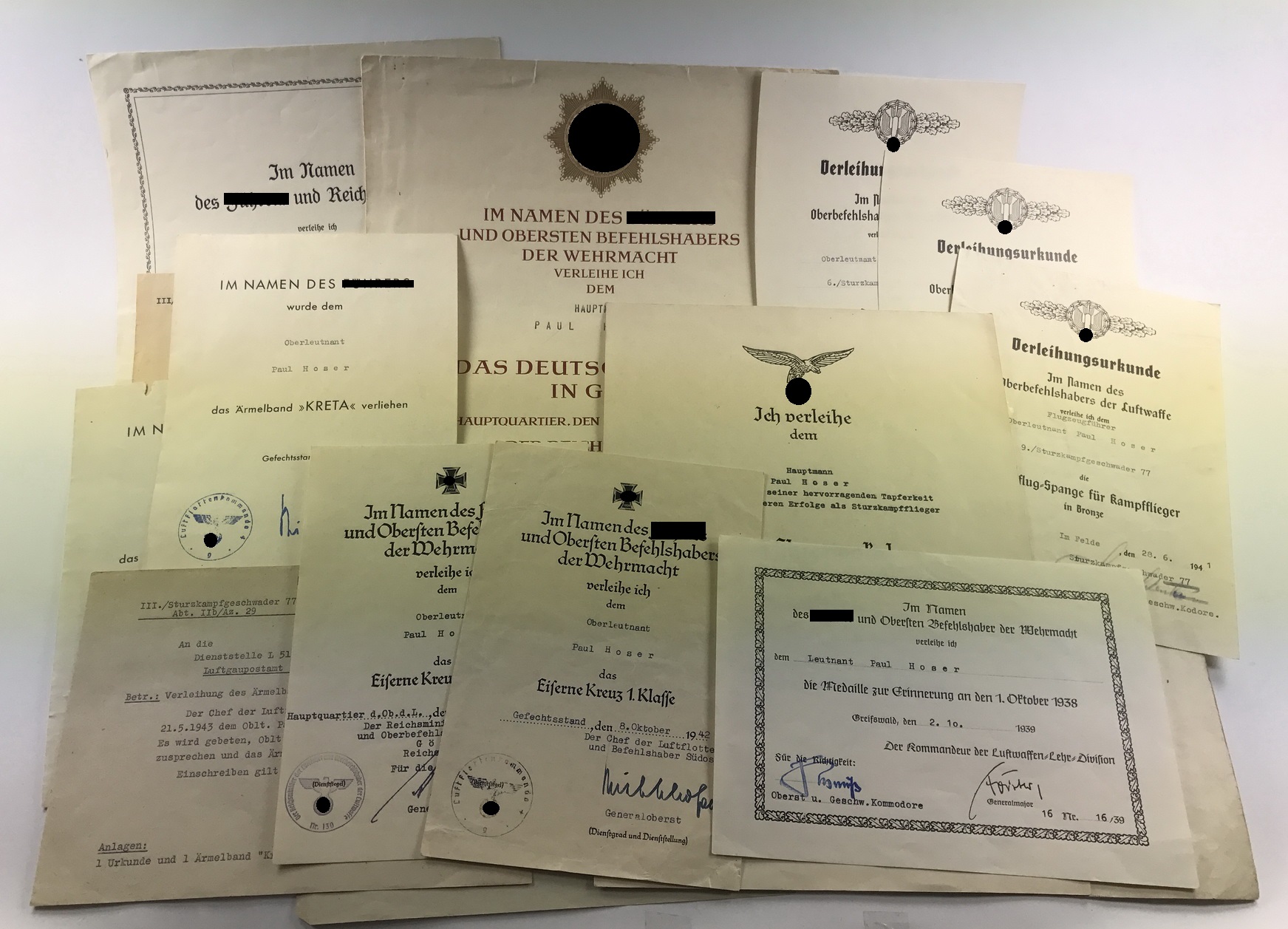Nachlass des Hauptmanns Paul Hoser. Paul Hoser diente im Sturzkampf Lehrgeschwader, im Sturzkampfgeschwader 77 und 1.. Er gilt seit den 1.9.1943 als vermisst im Raum Orel (Russland). Der Nachlass besteht aus folgenden Urkunden: