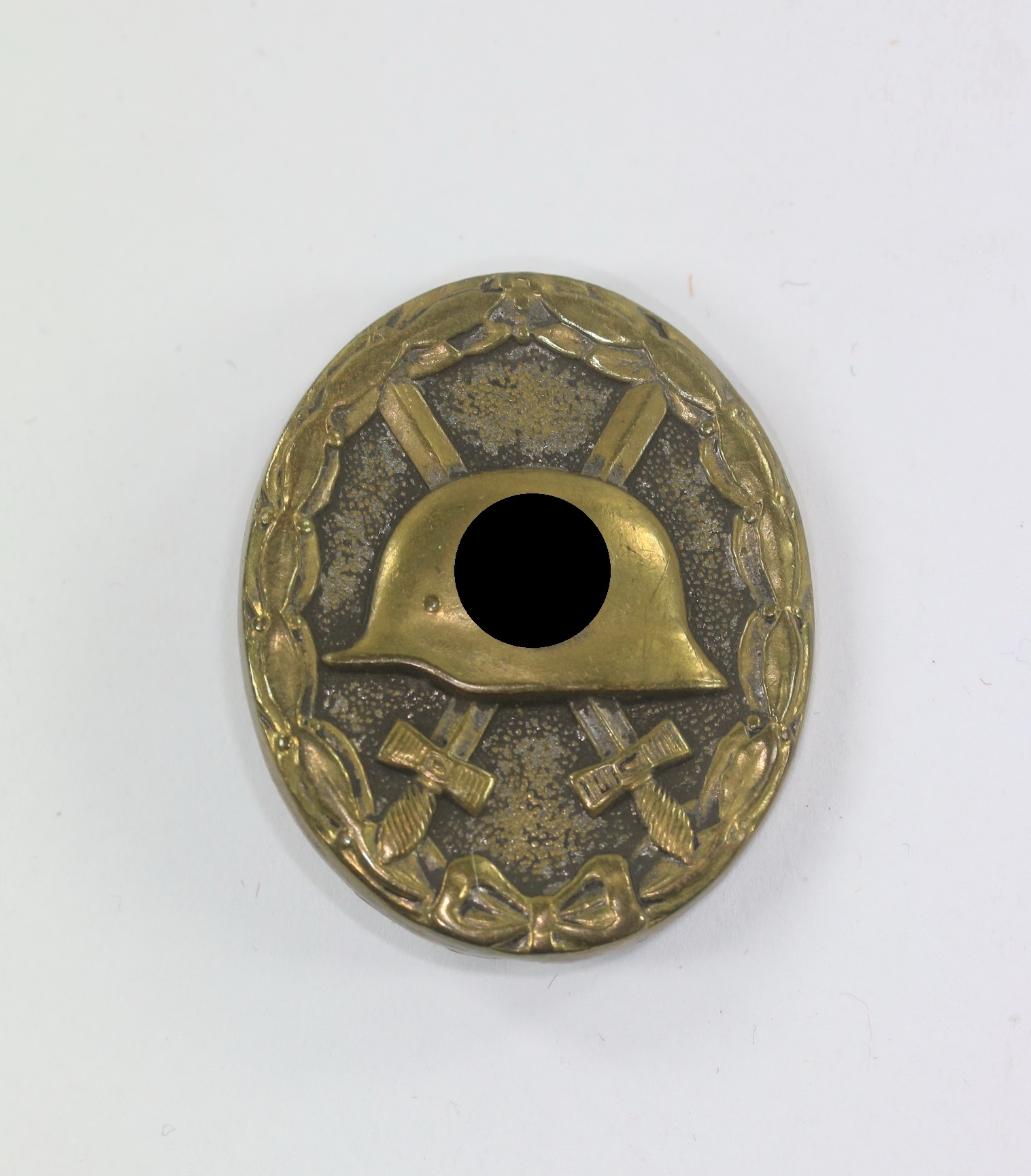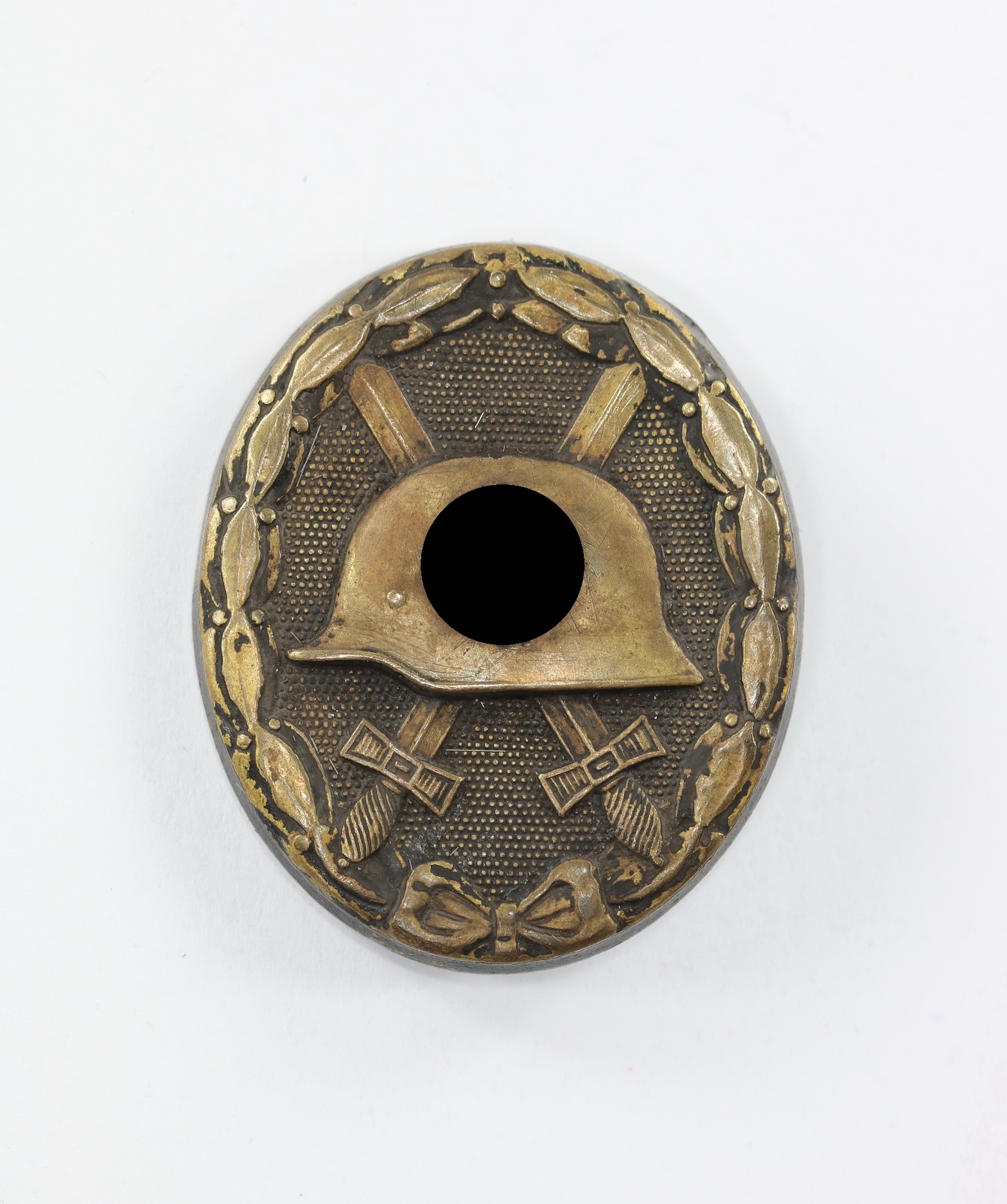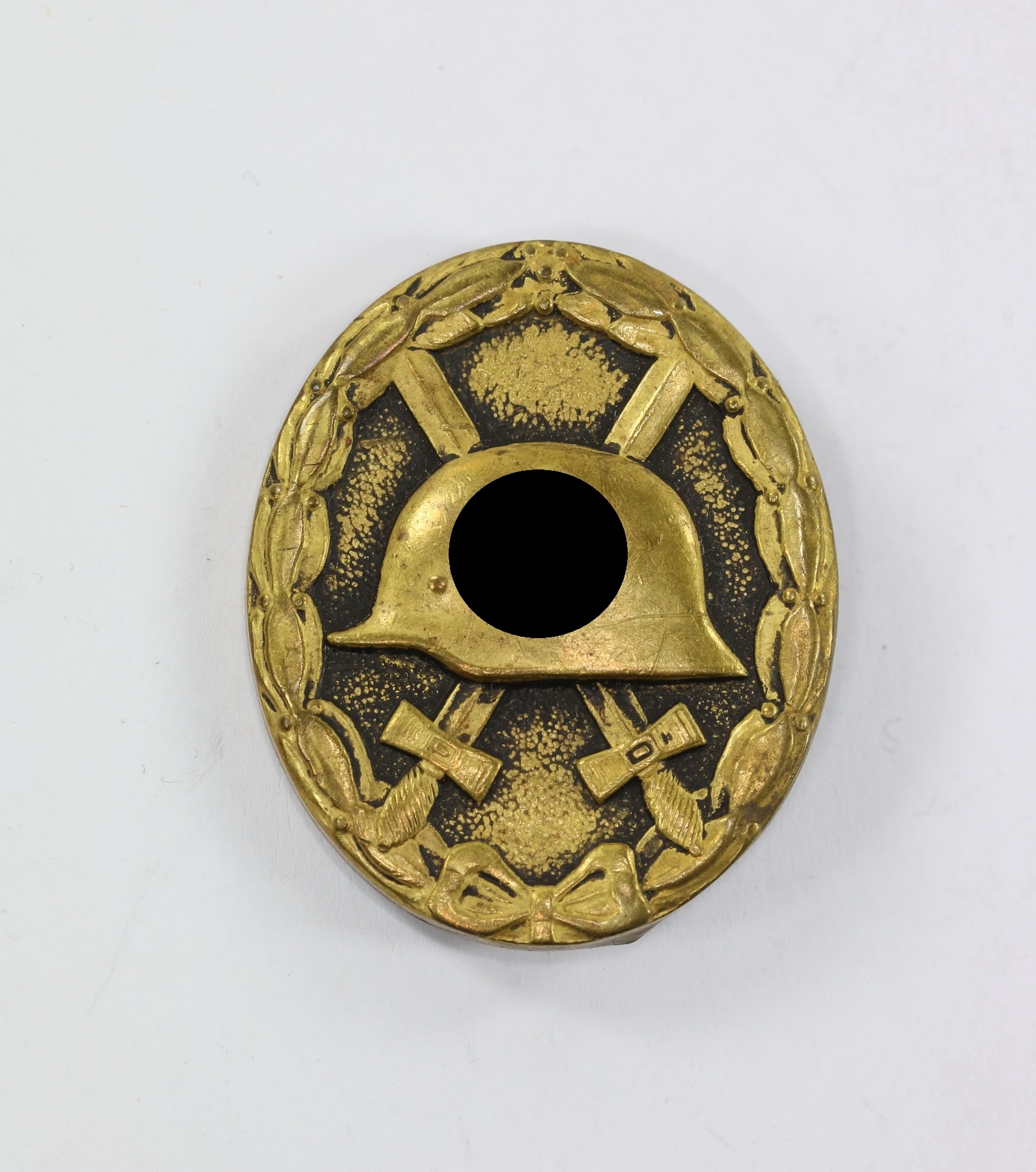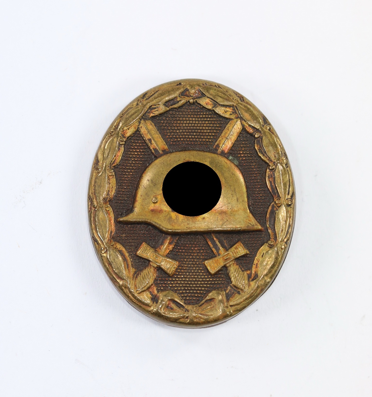 Tombak/brass based and in a good, somewhat worn condition. The black pint totally removed for use as a gold class badge.