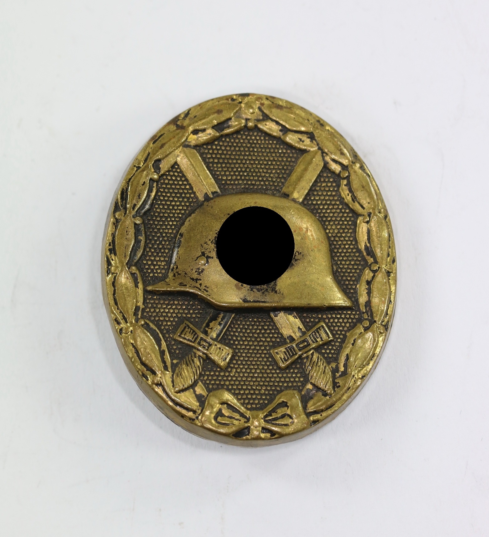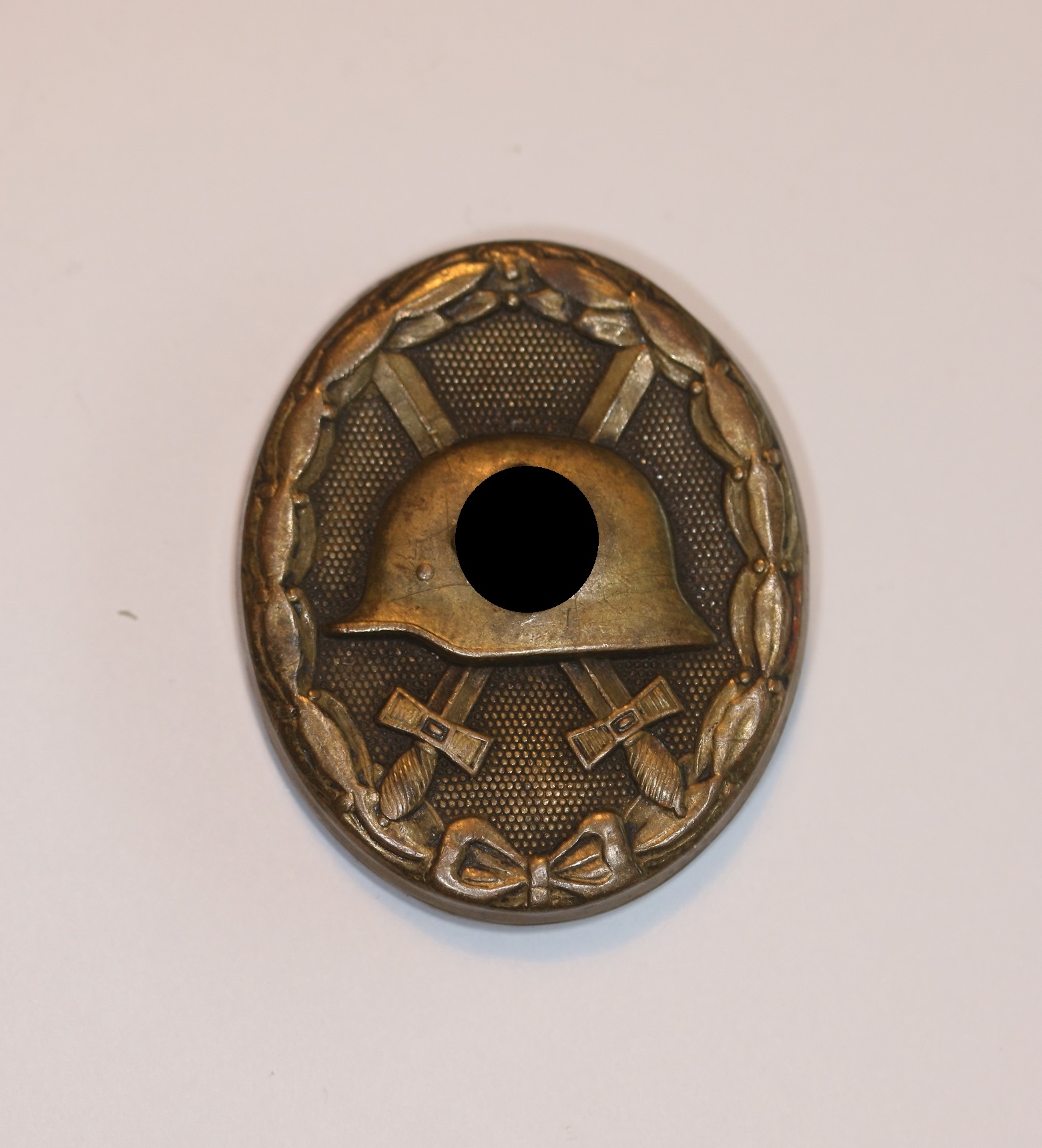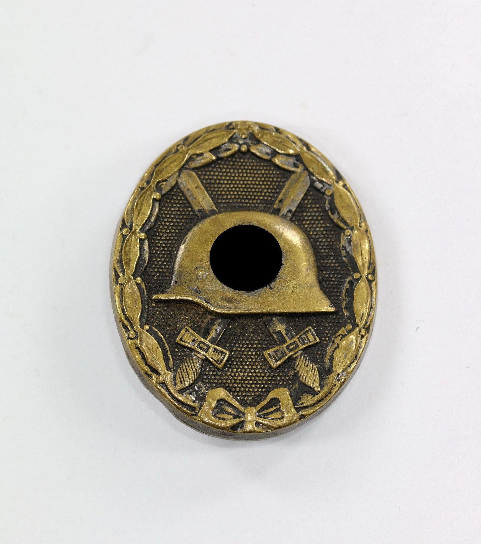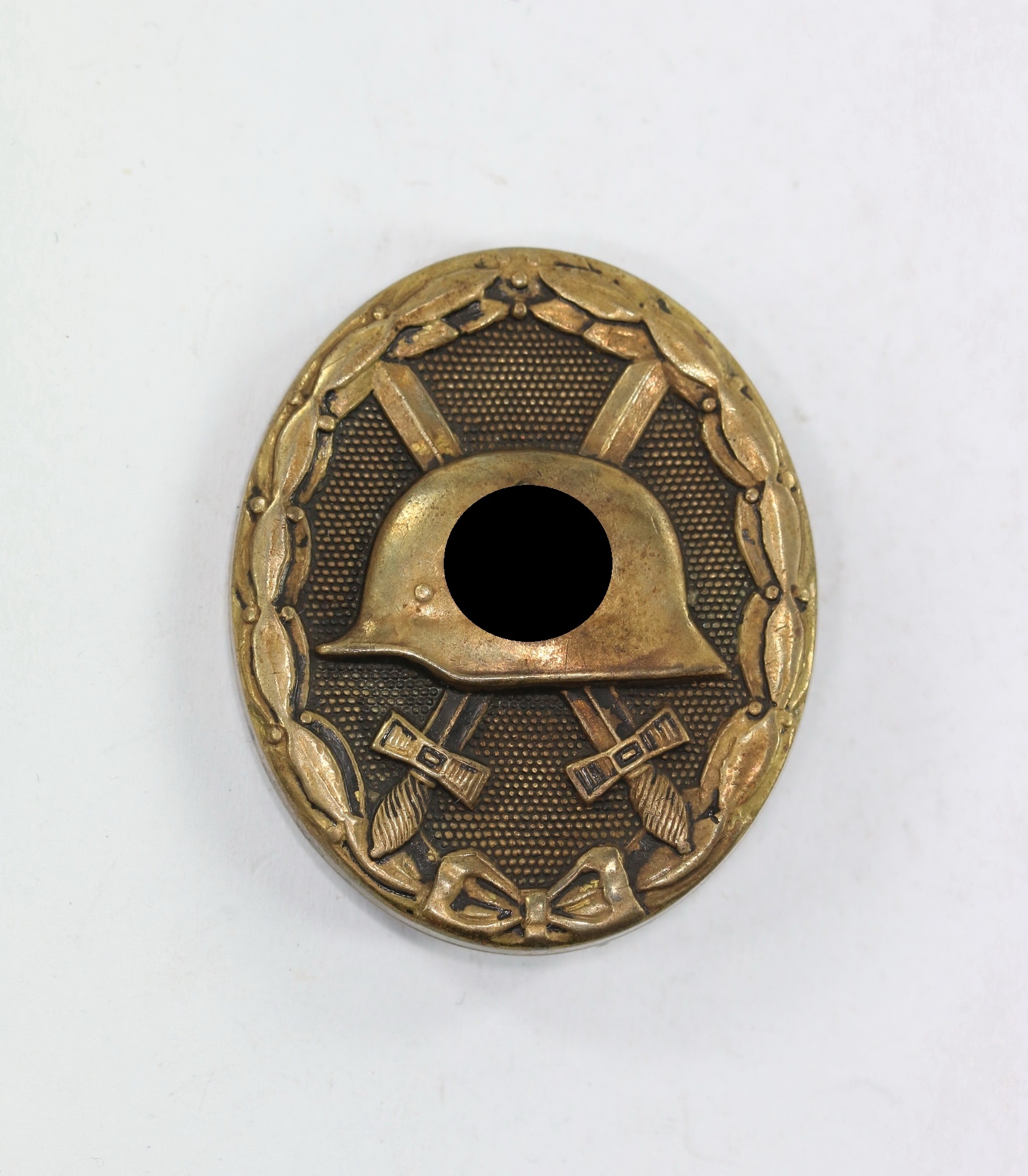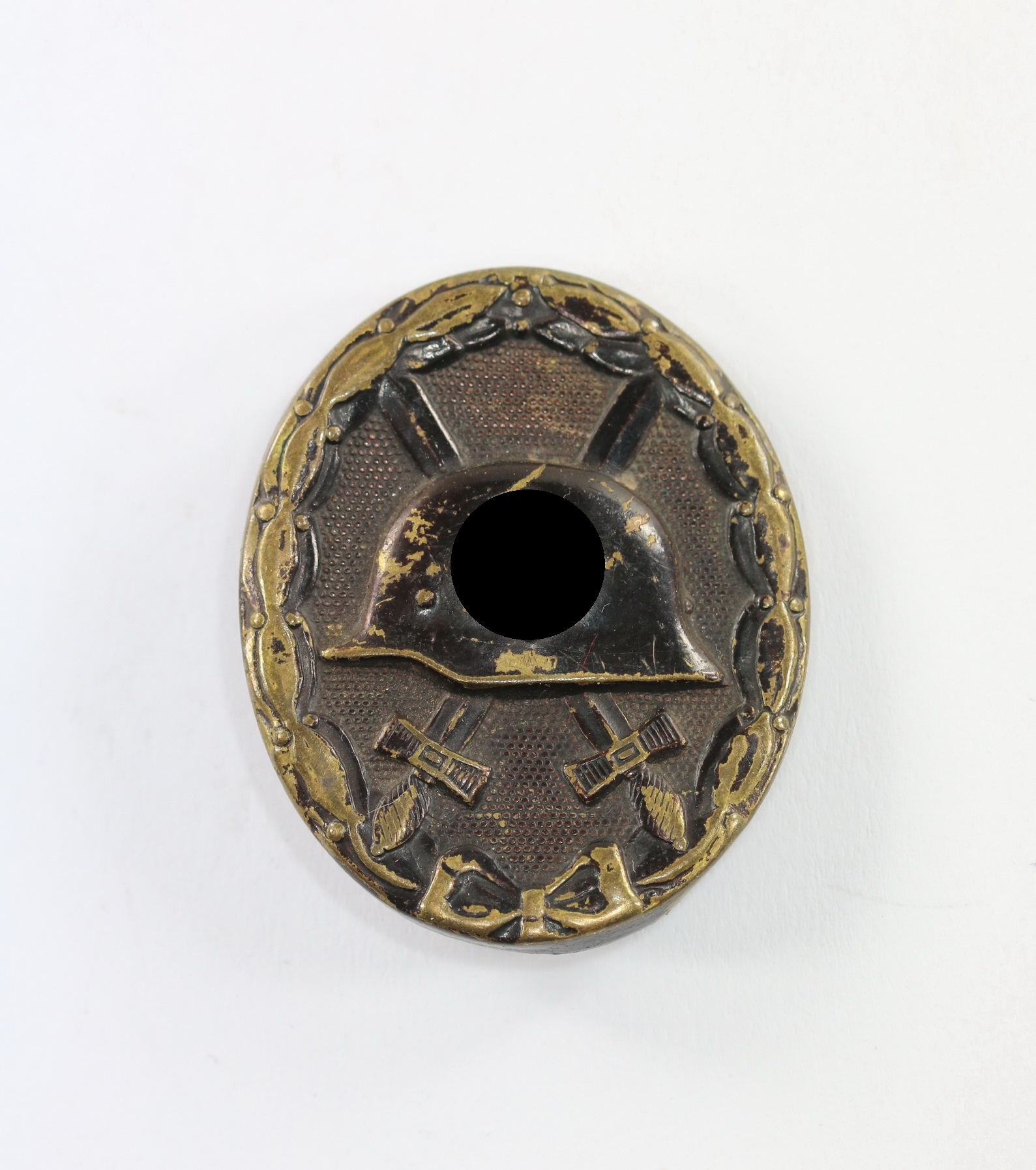 Tombak/brass based and in a good, somewhat worn condition. The black pint totally removed for use as a gold class badge.