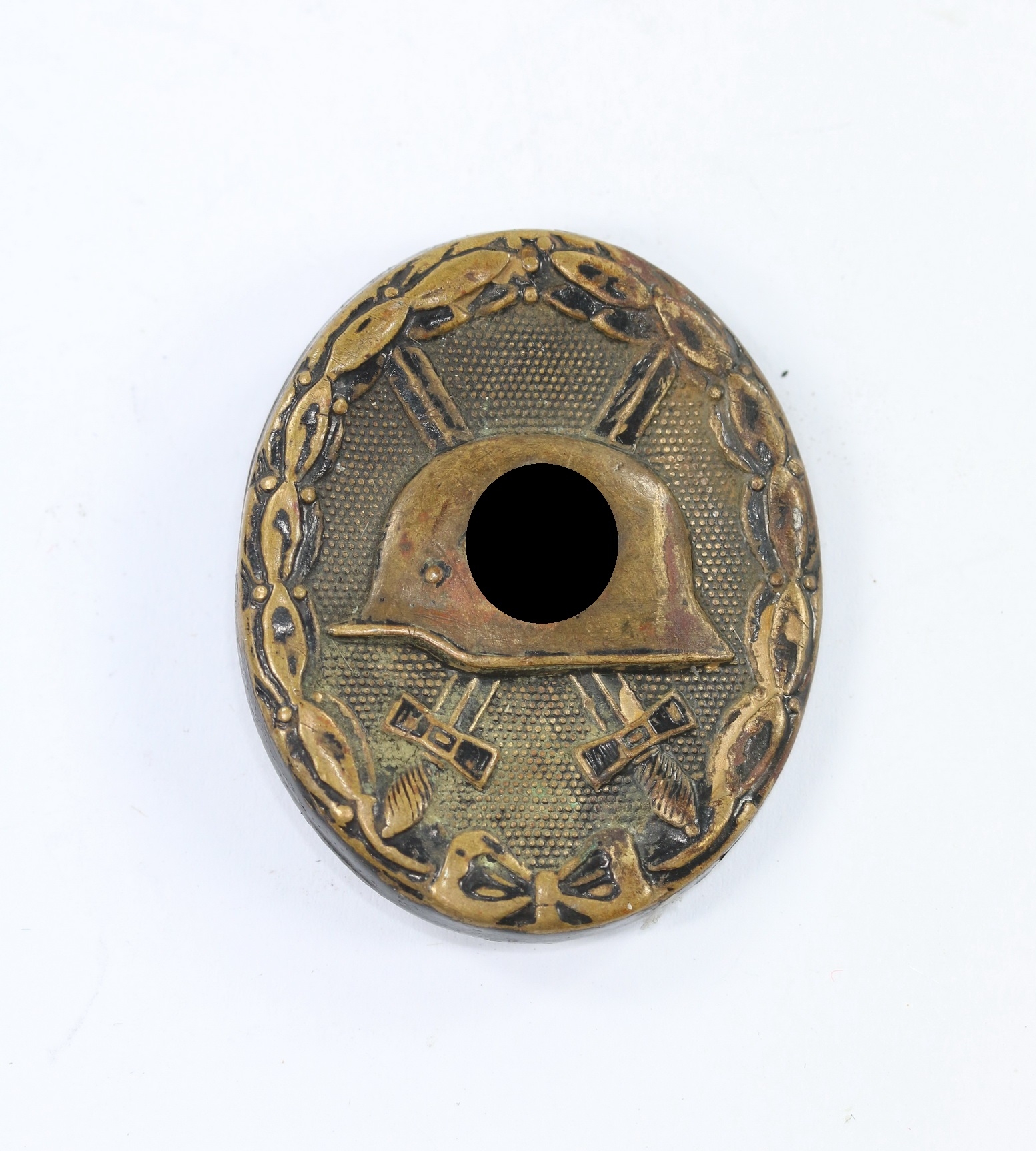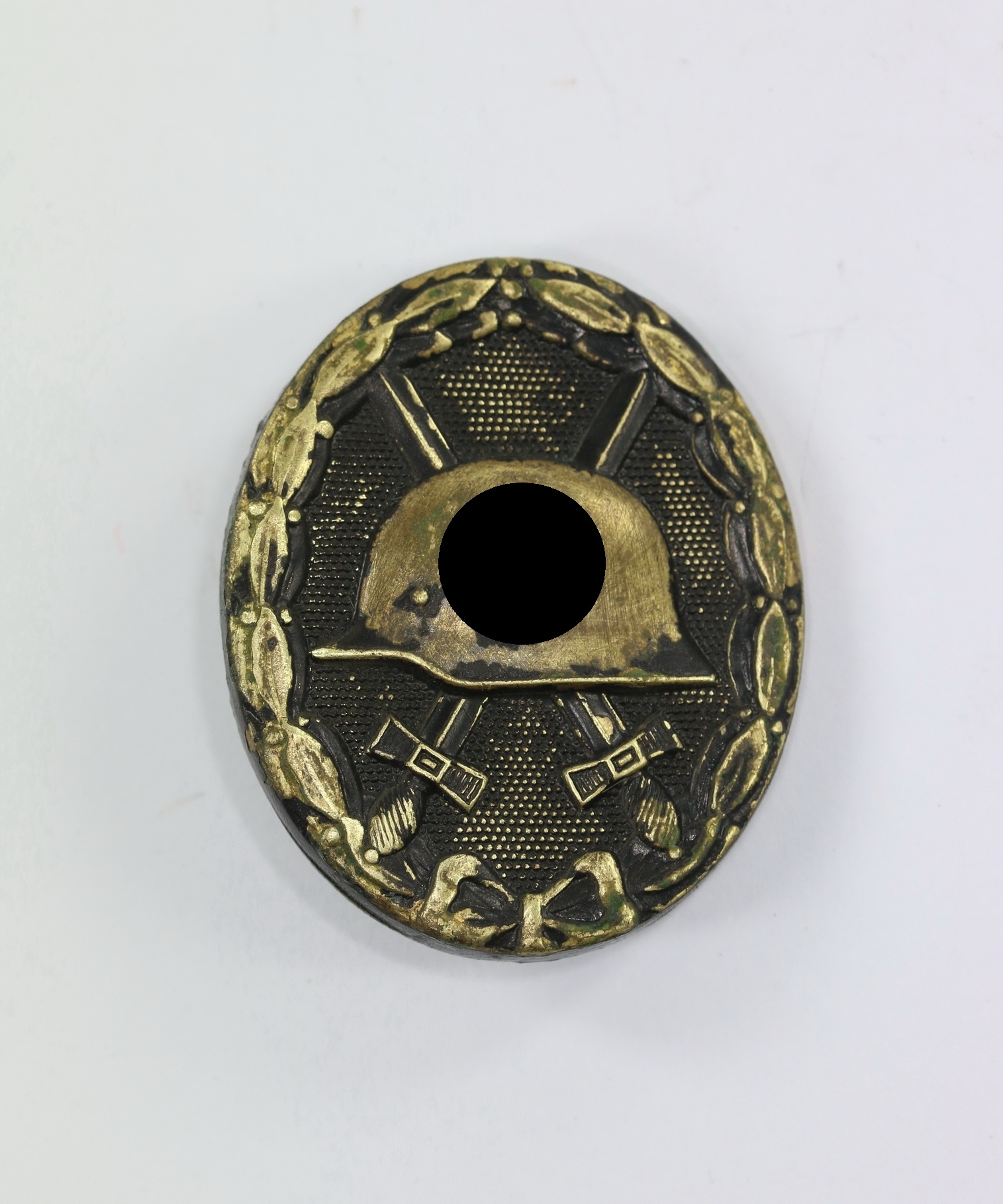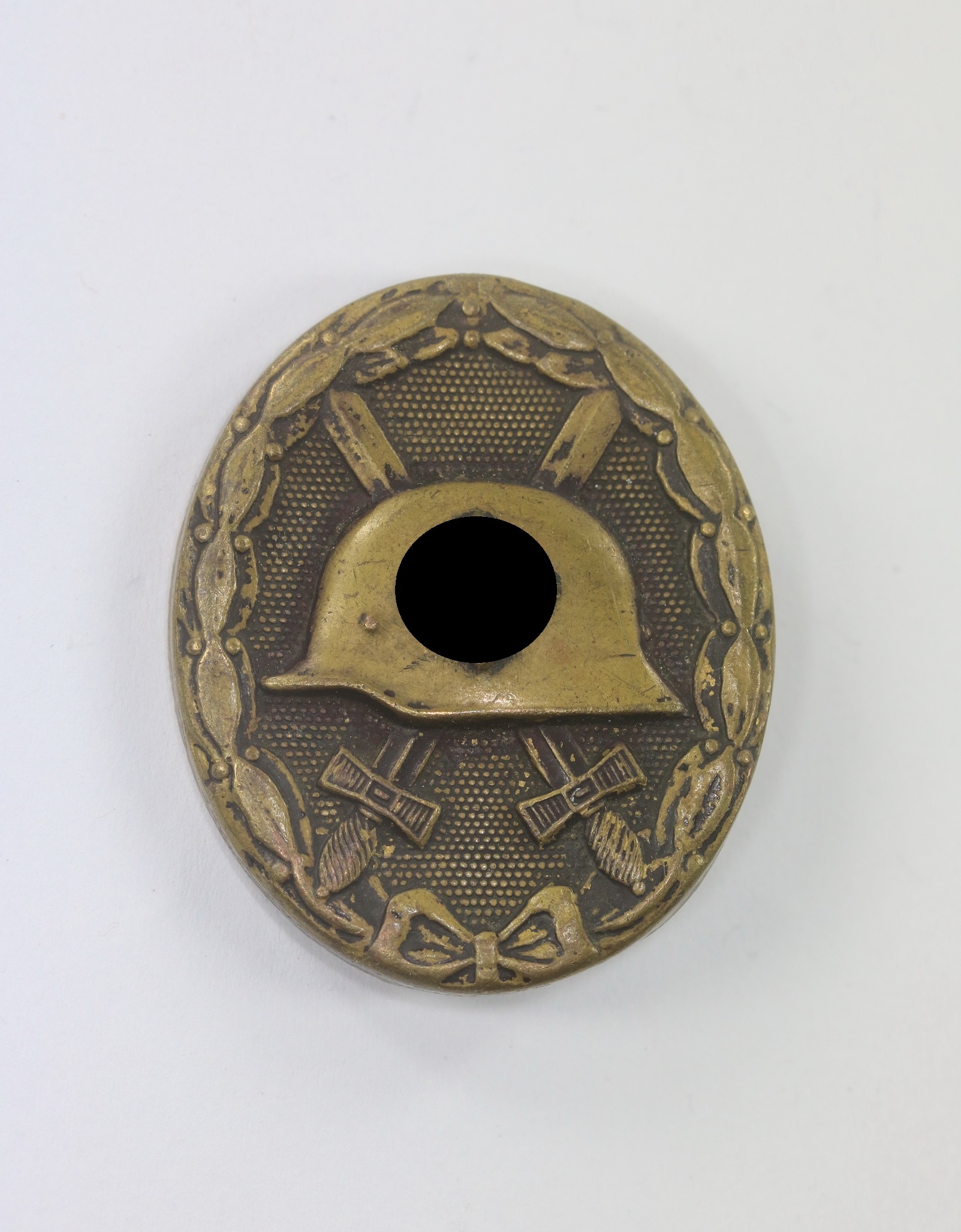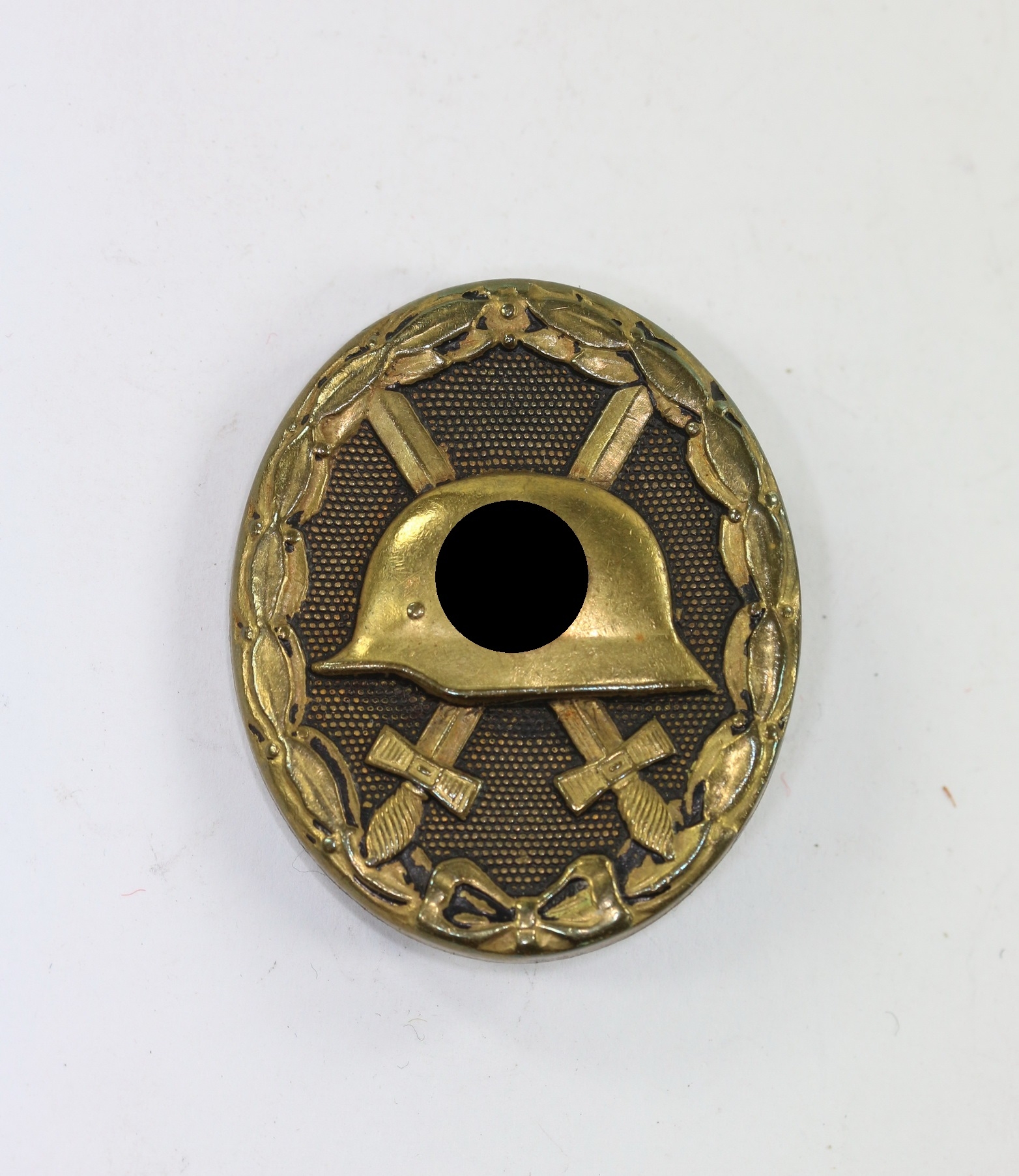 Tombak/brass based and in a good, somewhat worn condition. The black pint totally removed for use as a gold class badge.