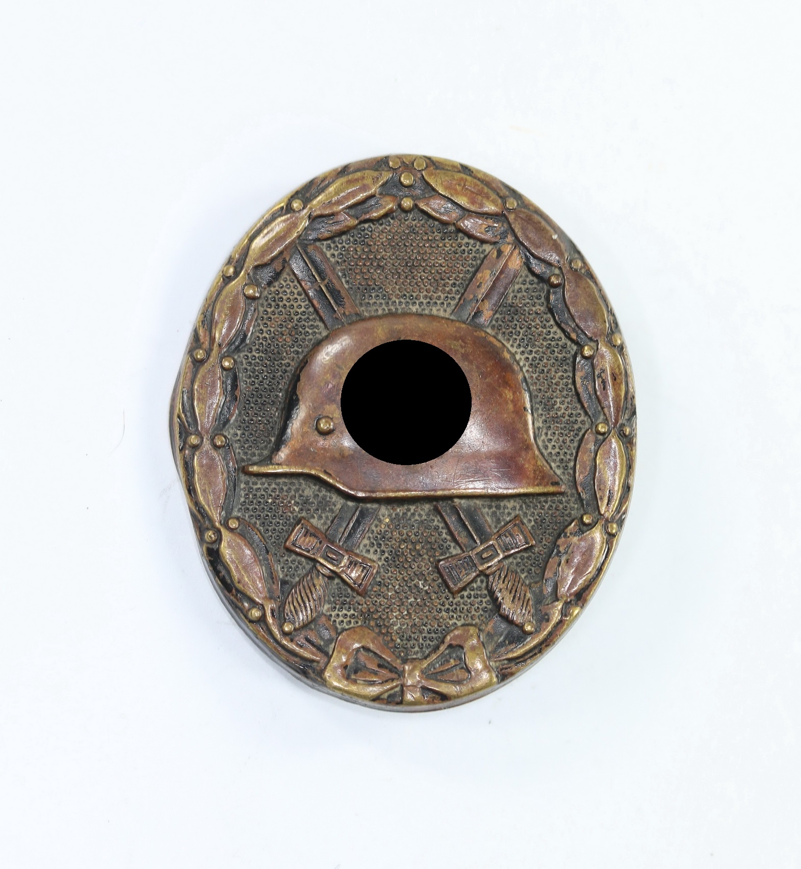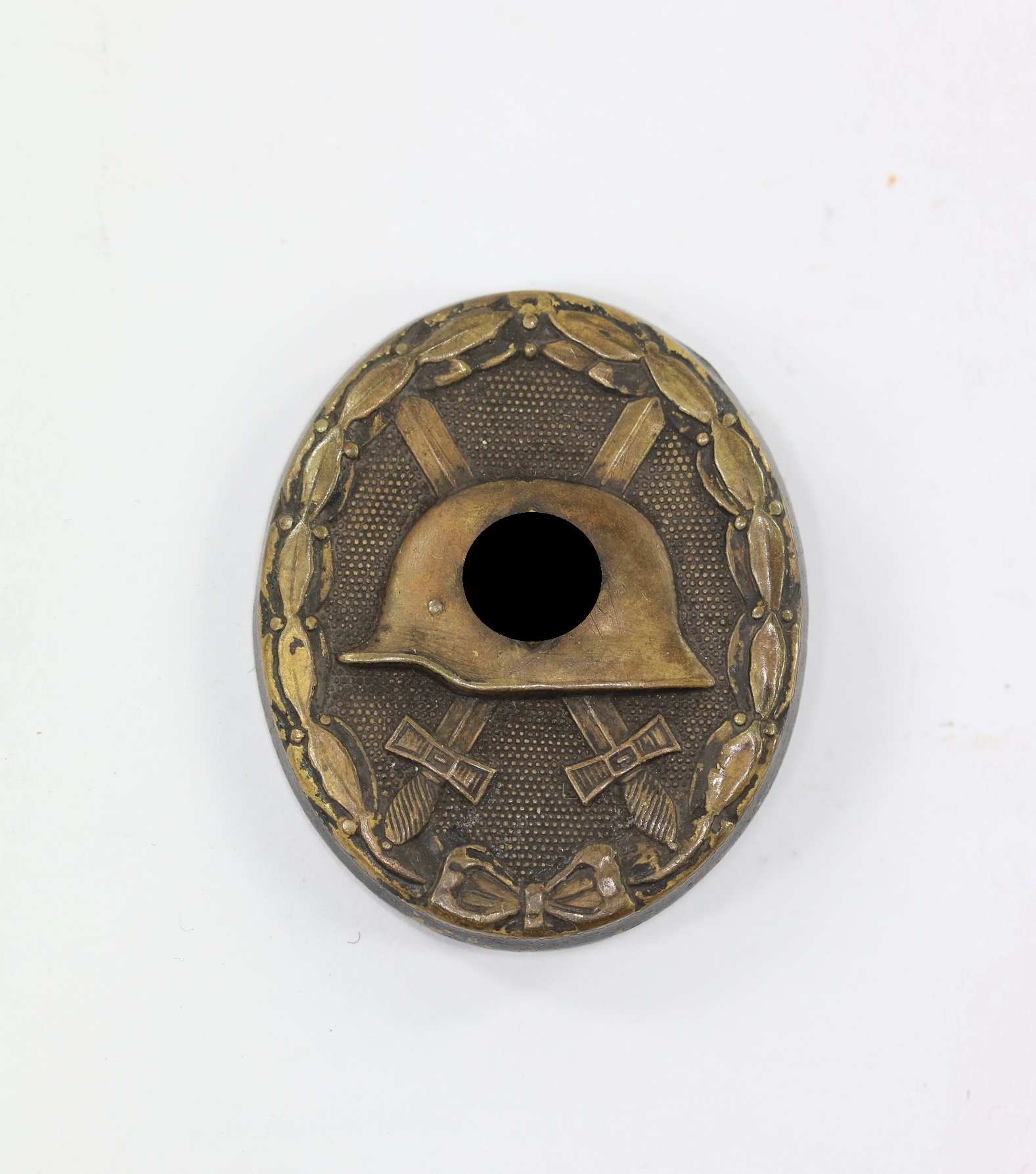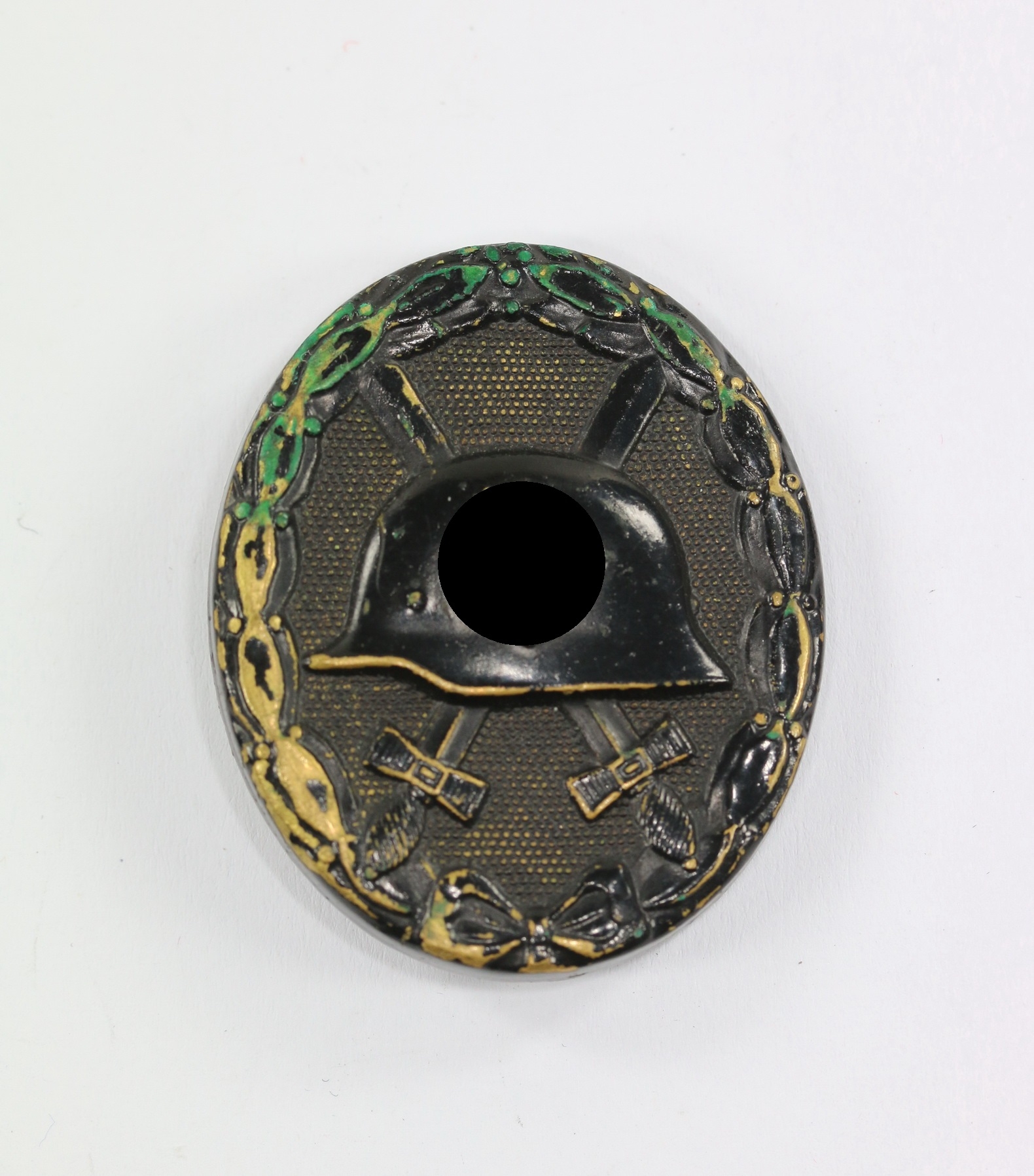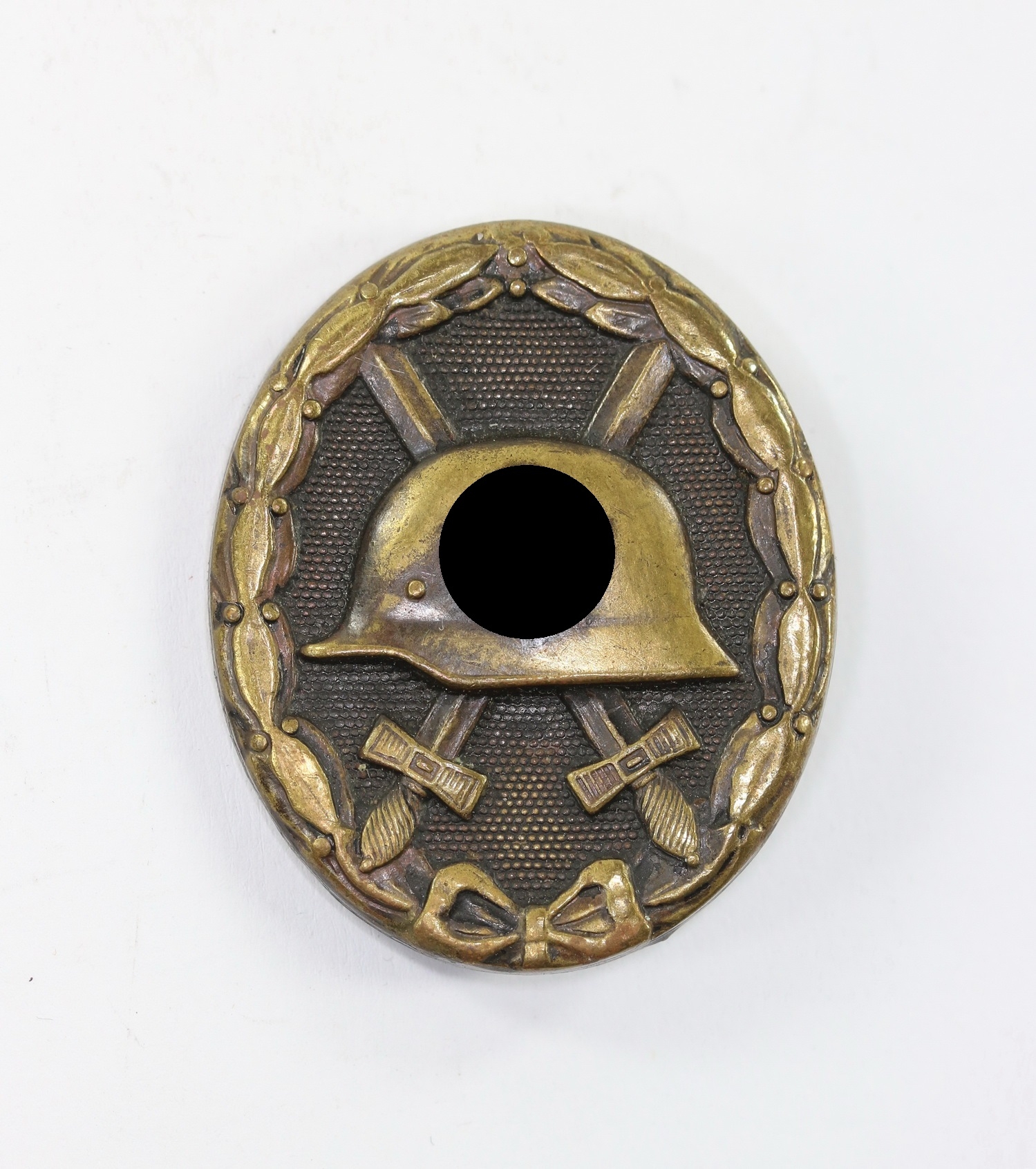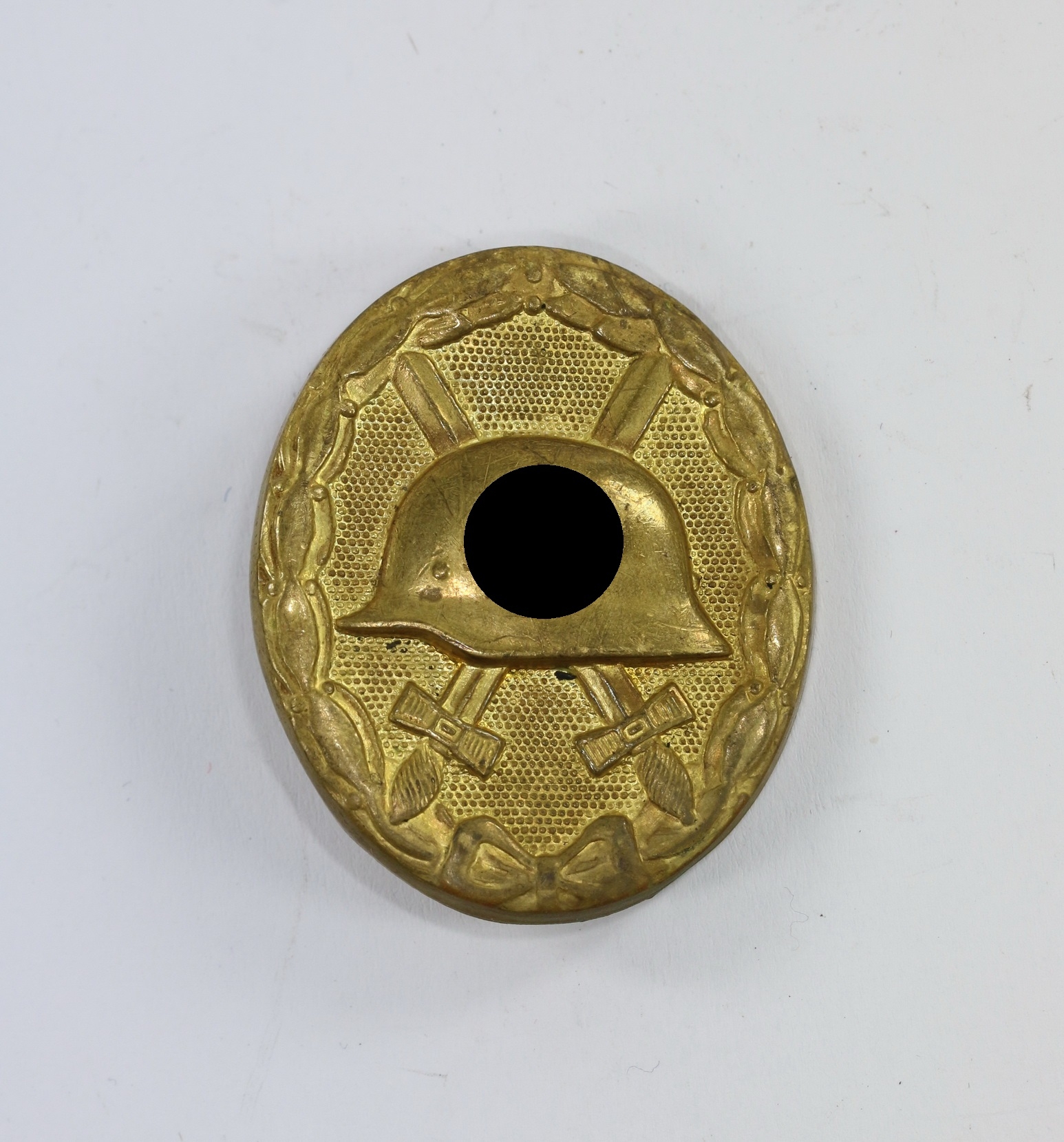 Tombak/brass based and in a good, somewhat worn condition. The black pint totally removed for use as a gold class badge.