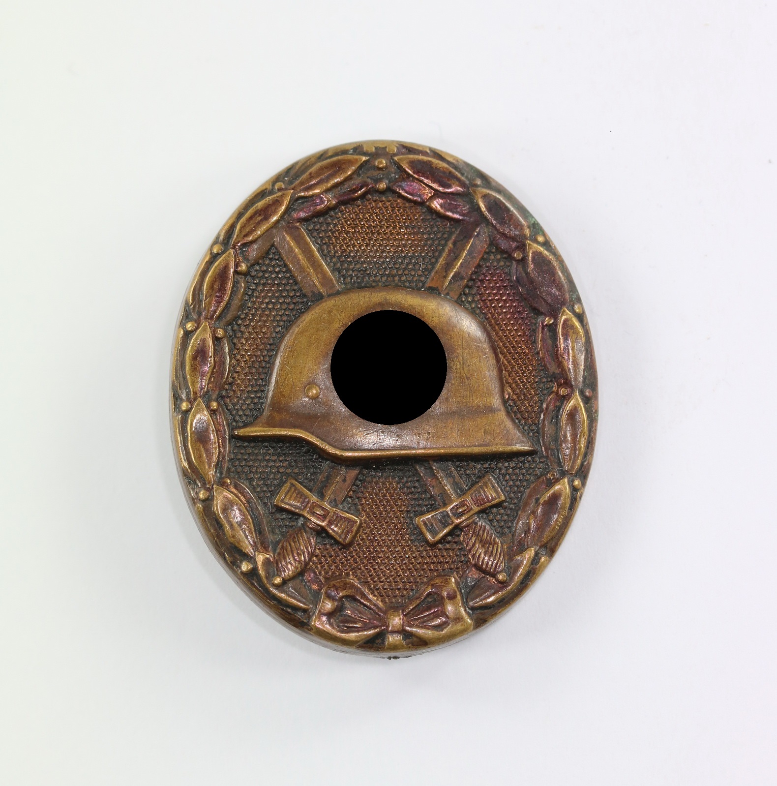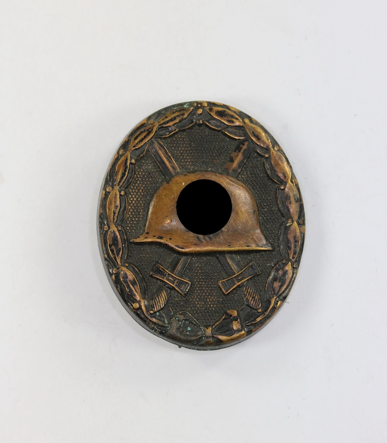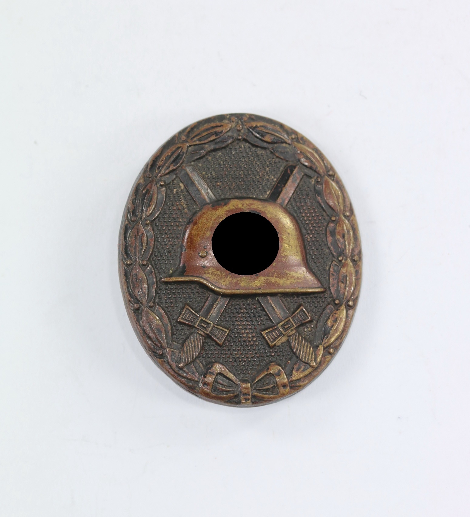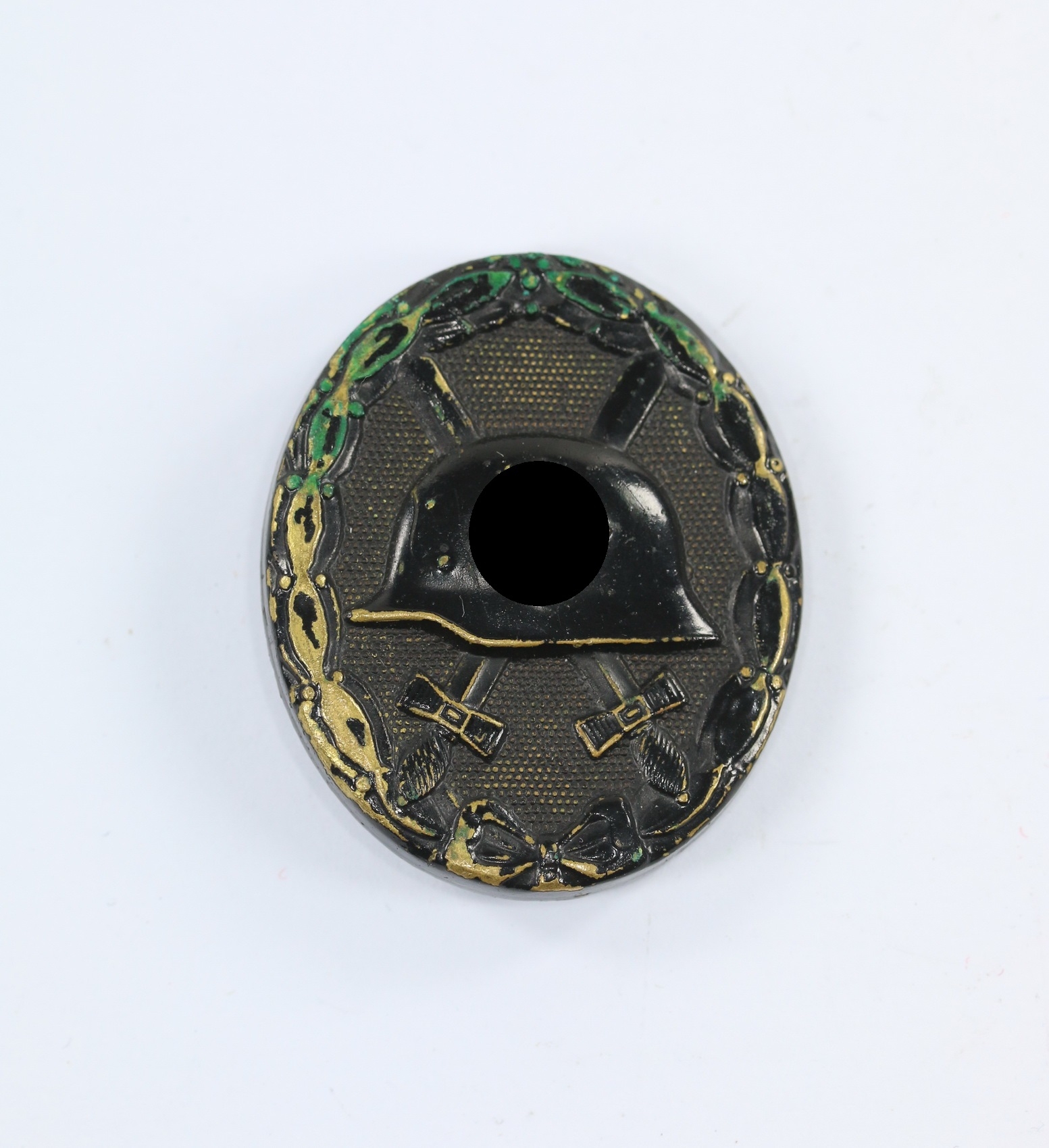 Tombak/brass based and in a good, somewhat worn condition. The black pint totally removed for use as a gold class badge.