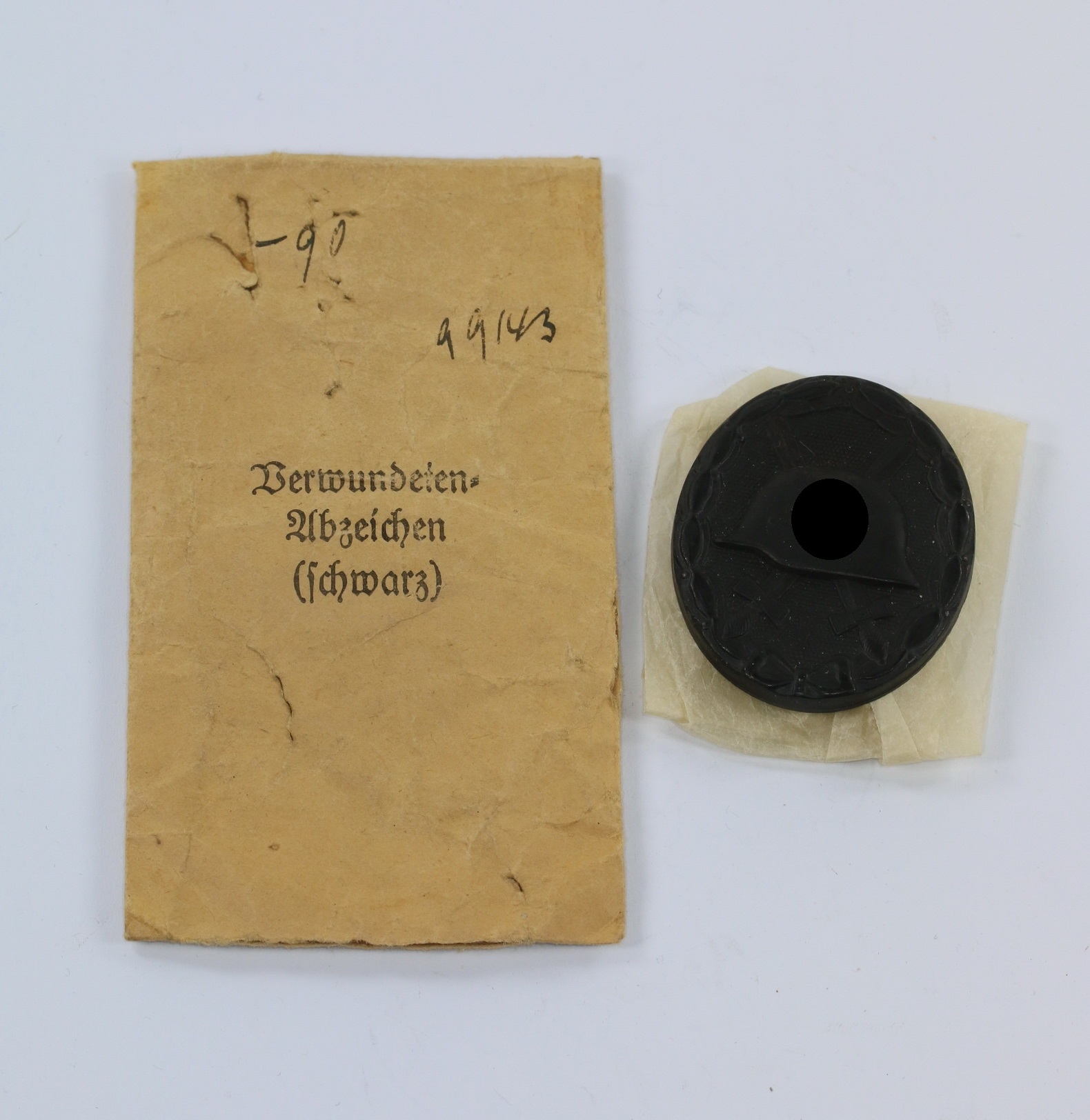 In zugehöriger Verleihungstüte. Die Tüte in einen sehr guten, etwas gebrauchten Zustand. Auf der Vorderseite der Aufdruck „Verwundetenabzeichen (schwarz)“. Rückseitig der Hersteller Stempel „B.H. Mayer Pforzheim“ und die zugehörige LDO Nummer „L/18“ und der Stempel „März 1943“.