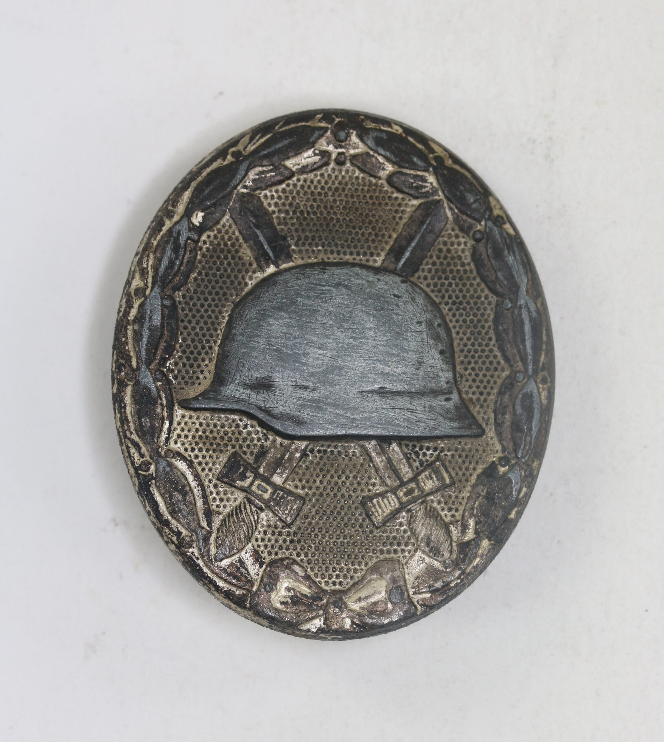 Zink, in der Kriegsgefangenschaft entnazifiziert(!), sonst sehr guter, getragener Zustand. Mit Hersteller „107“ für die Firma Carl Wild, Hamburg.