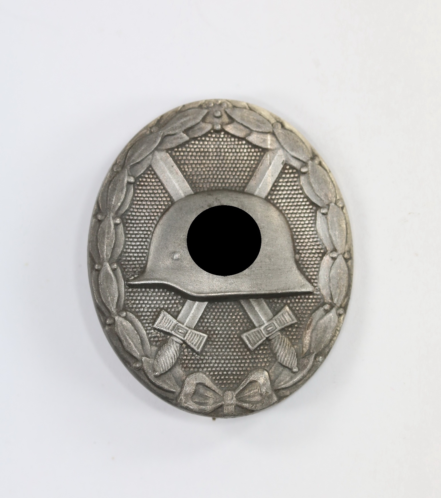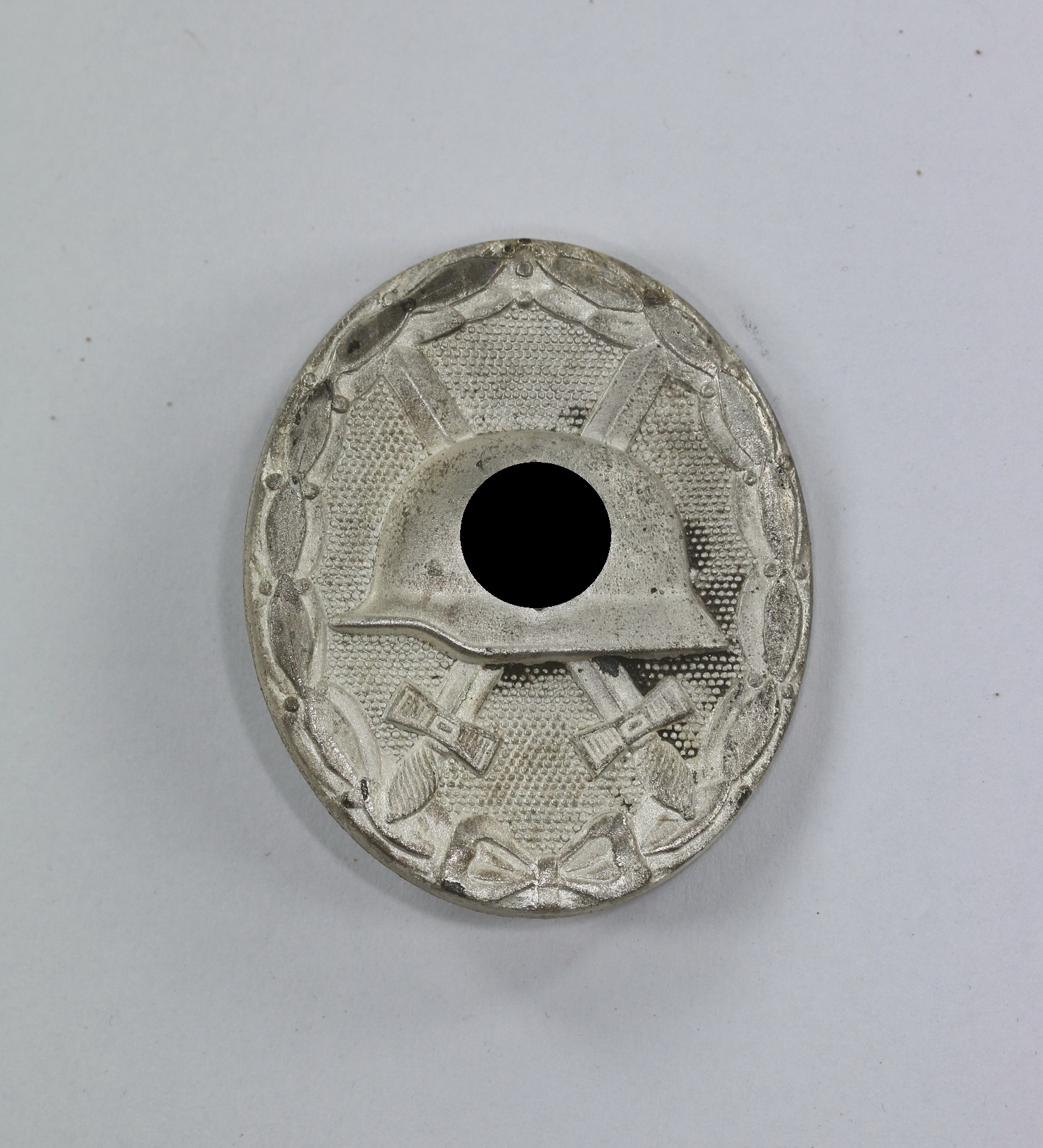 Zink, sehr guter, ungetragener Zustand. Mit vollständiger Versilberung und leichten Ansätzen von Patina. Mit Hersteller „26“ für die Firma B.H. Mayer, Pforzheim.