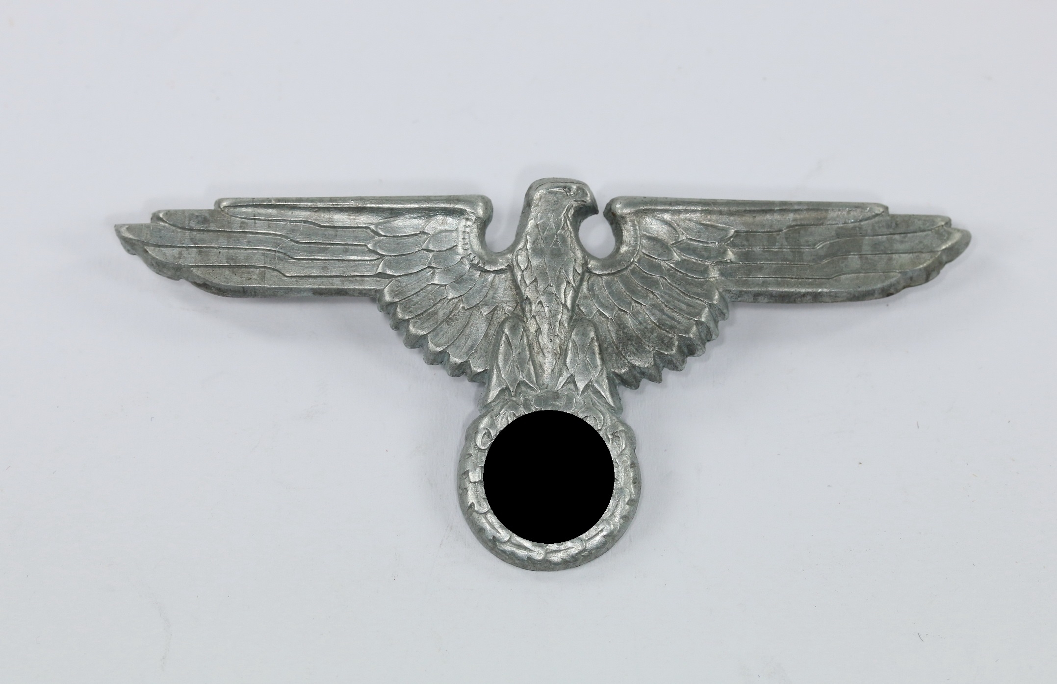 Zink, sehr guter, ungetragener Zustand. Mit vollständiger Versilberung. Ohne Hersteller, aber eine bekannte Variante, der Firma Assmann & Sohn, Lüdenscheid (RZM 155/38). Beide Splinte vollständig und unversehrt.