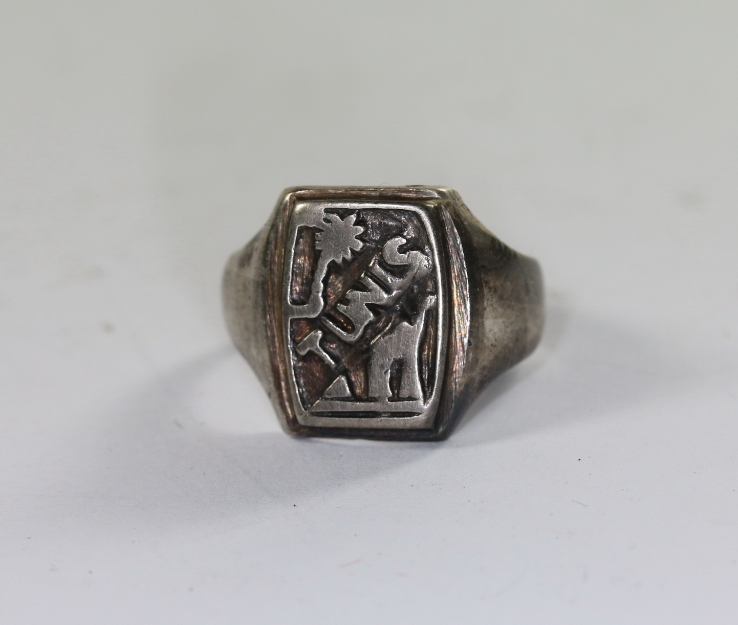 Buntmetall versilbert. Sehr guter, leicht getragener Zustand. „Tunis“ mit Dromedar und Palme. Gewicht 8,7 Gramm, Innendurchmesser ca. 19,80 mm.