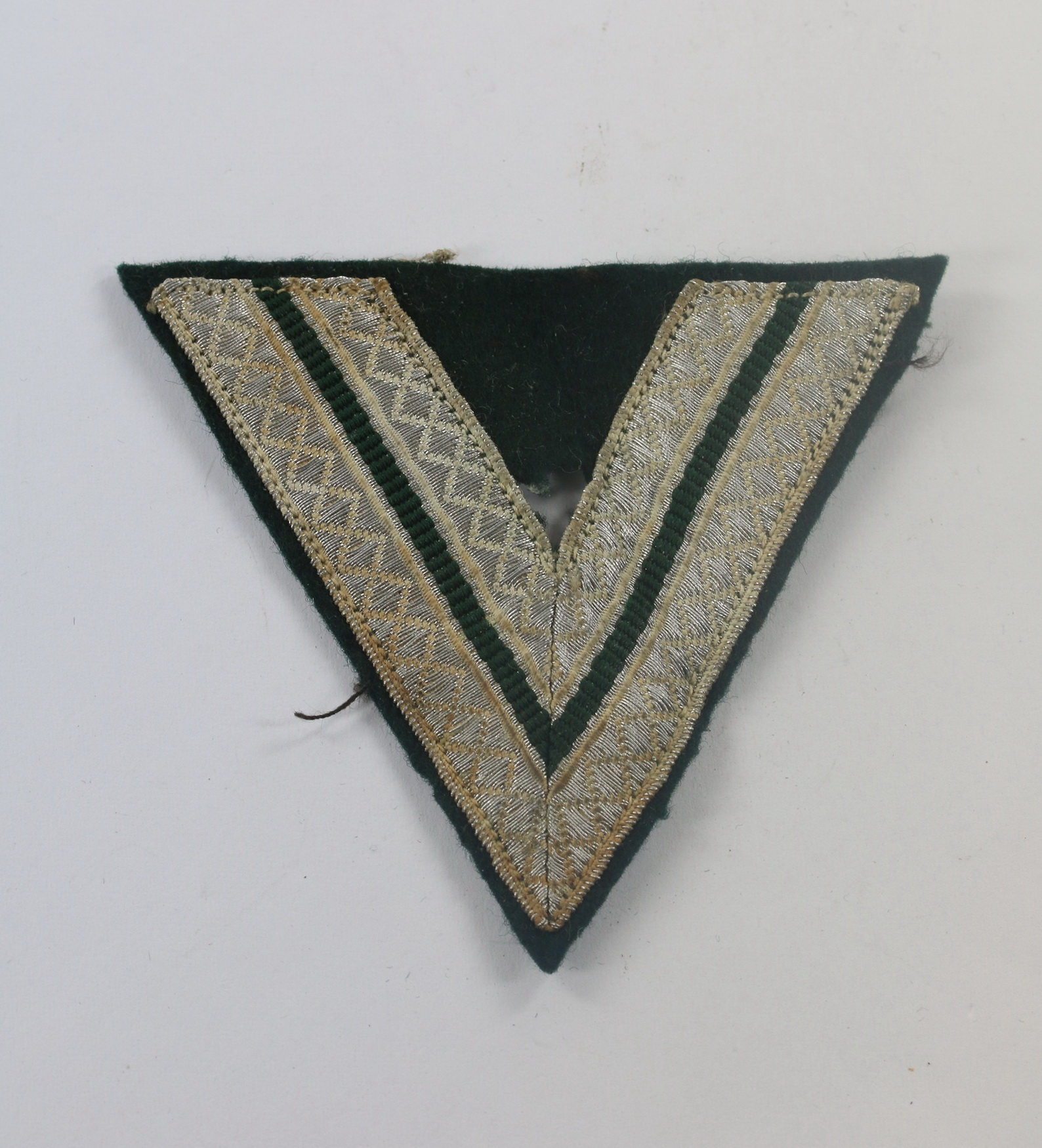 Silver brain on dark green backing and in a very good, unworn condition. With a moth hole and some nipping.