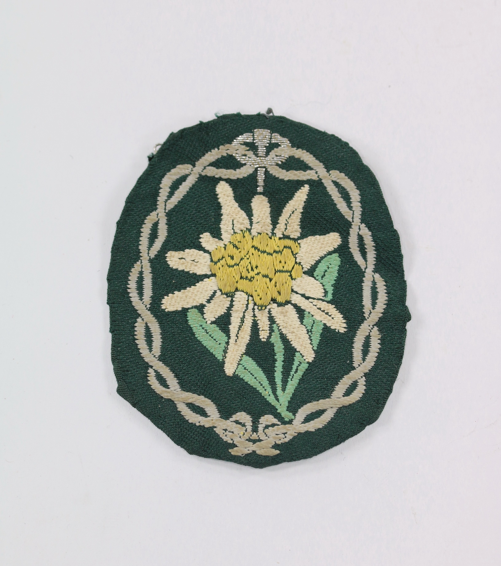 Bevo-woven pattern on dark green and in a very good, slightly worn condition.