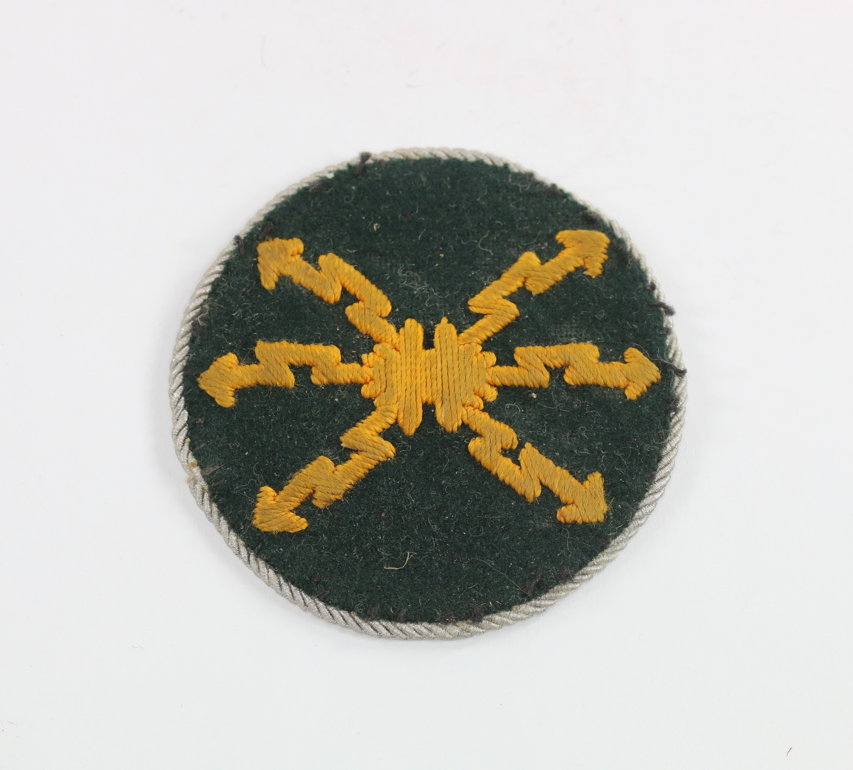 Machine embroided type with silver cord. Very good, slightly used condition.