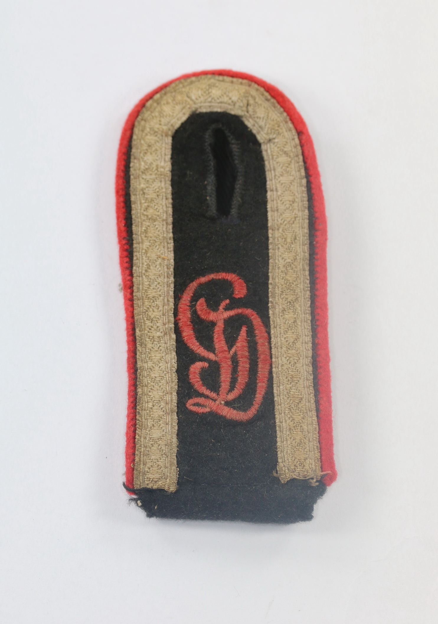 Schwarze(!) Schulterklappe. Sehr guter, nur leicht getragener Zustand. Mit roter Paspelierung (Artillerie) und gestickter Auflage „GD“. Zum einschlaufen.