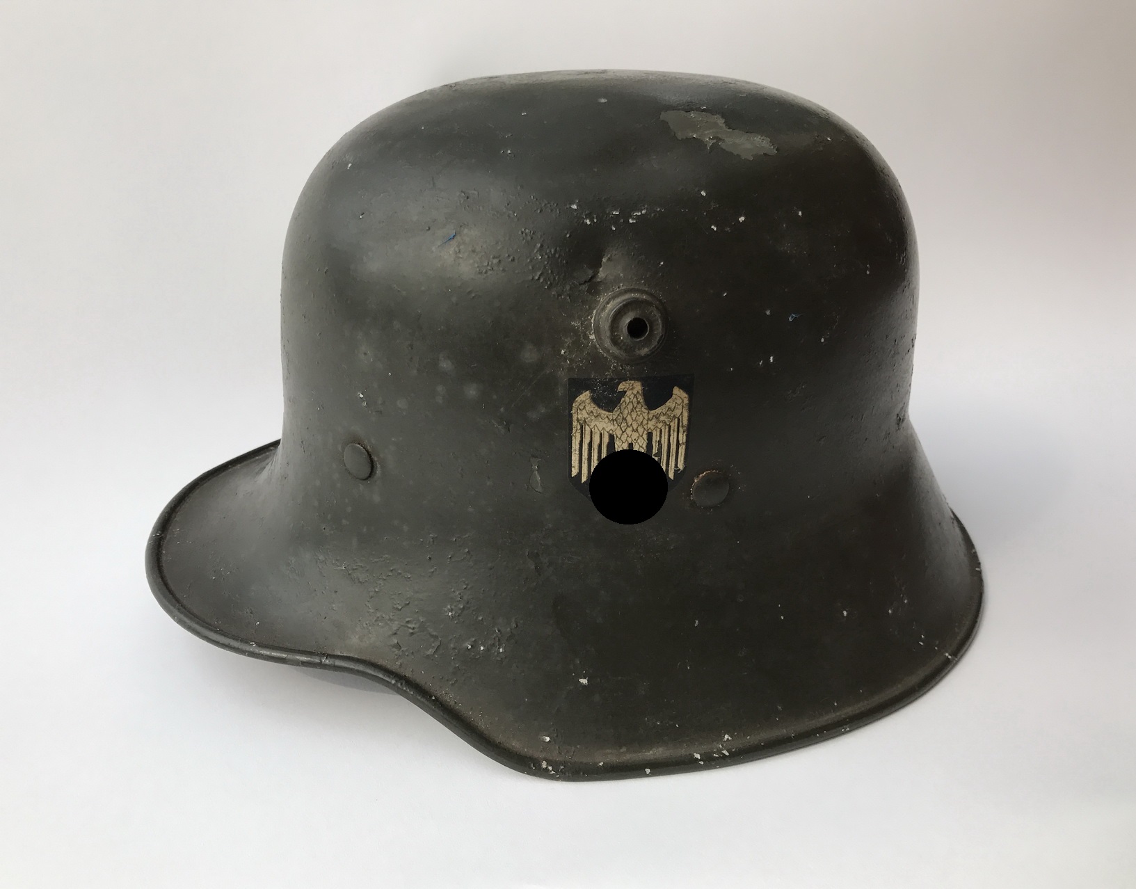 Two small dents but otherwise in a very good, slightly worn condition with approx. 95% of the original green paint. Both decals present, the eagle Shield to approx. 95%, the tricolour at approx. 90%.