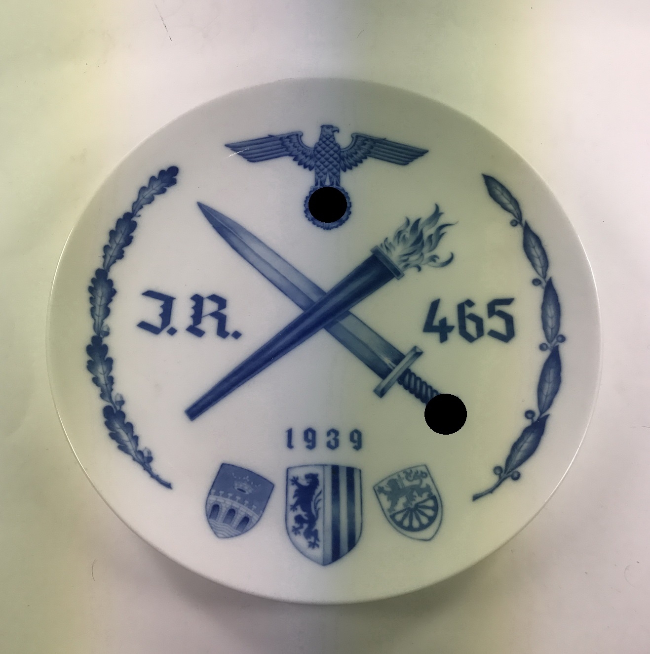 Sehr guter, einwandfreier Zustand, ohne jeden Fehler. Blaue unterglasur Bemalung. Gekreuztes Schwert mit Fackel unter Reichsadler mit Hakenkreuz, Schriftzug „I.R. 465“ (Infanterie Regiment 465), umgeben von Eichenlaub und Lorbeerblättern, unten die Jahreszahl „1939“ und drei Stadtwappen (eines Dresden). Durchmesser ca. 25 cm.