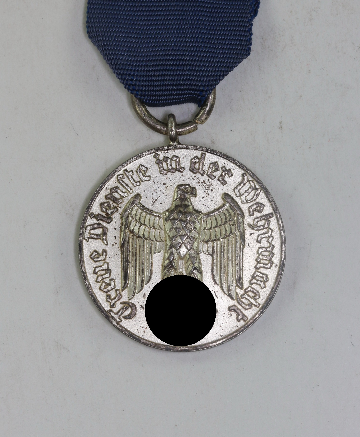 Eisen versilbert, sehr guter, nur leicht getragener Zustand. Mit vollständiger Versilberung und unberührter Patina. Am blauen Band mit aufgelegten Hoheitsadler.
