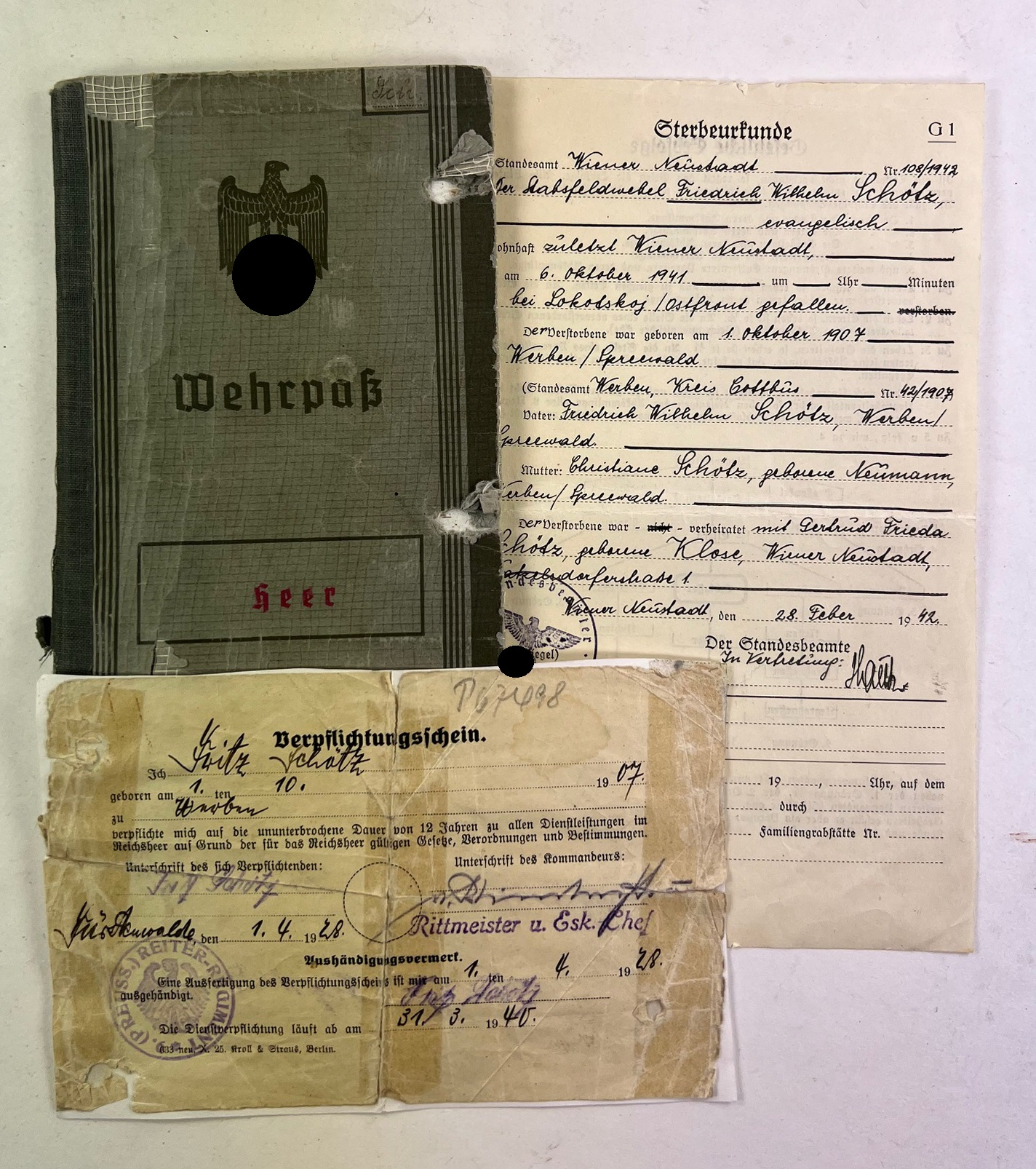 Sehr guter, nur leicht gebrauchter Zustand. Alle Seiten vorhanden, mit Foto in Uniform. 1928 in das Reiter Regiment 9 (Fürstenwalde) der Reichswehr eingetreten. Ab 1939 bei der Panzertruppe der wehrmacht. Erst bei der Panzer Ersatzabteilung 4, später im Panzerregiment 39. Er wurde mit der Wehrmachtsdienstauszeichnung, den Eisernen Kreuz 2. Klasse und den Panzerkampfabzeichen in Silber ausgezeichnet. 1942 fiehl er in Russland.