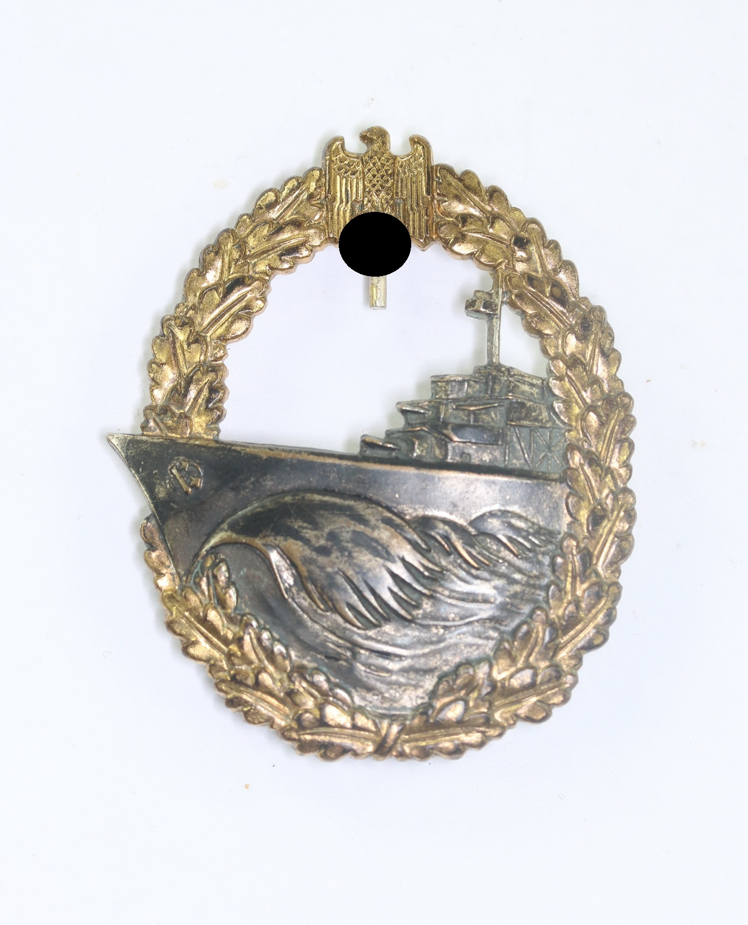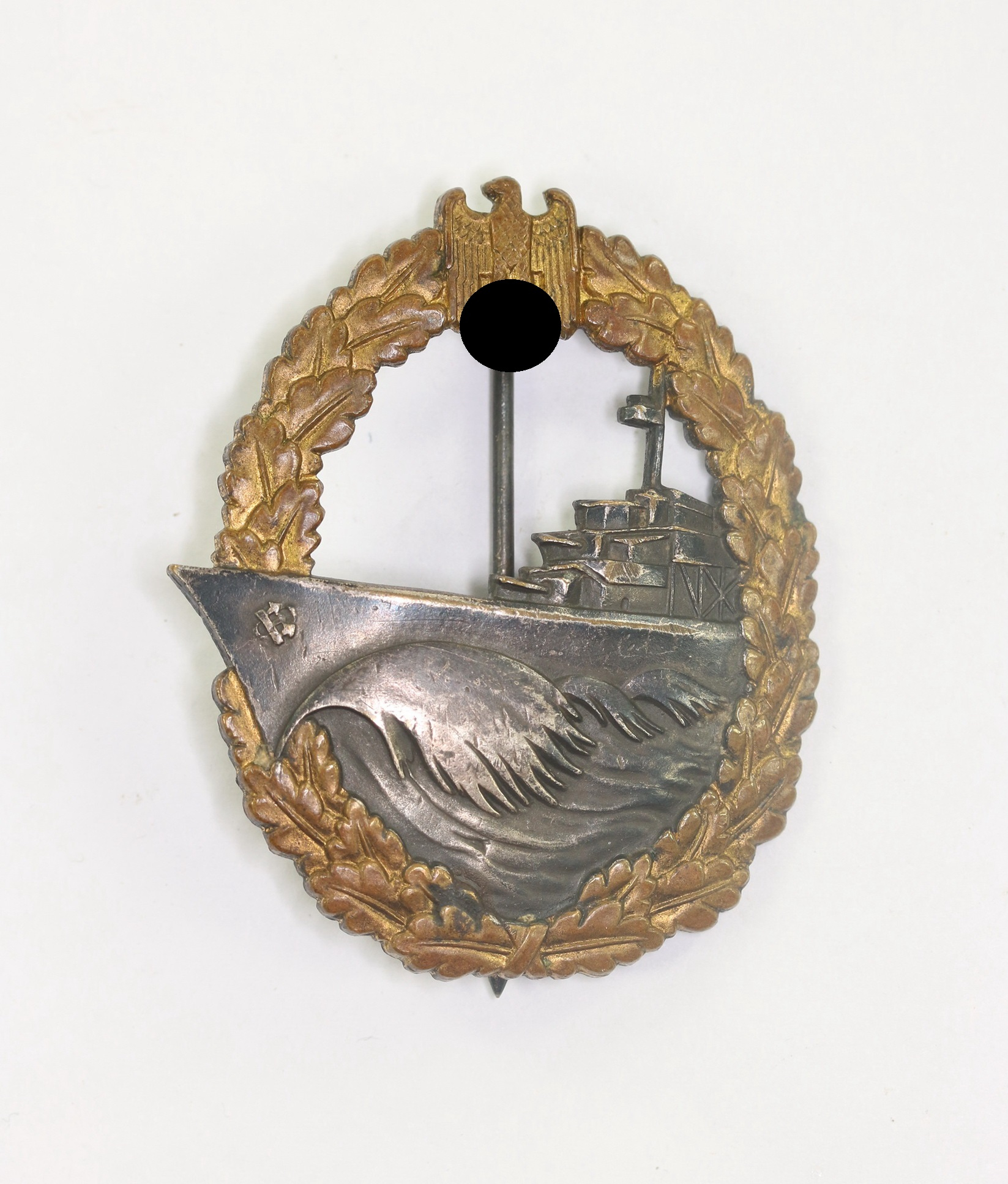 Buntmetall, sehr guter, leicht getragener Zustand. Ohne Hersteller, aber eine bekannte Variante der Firma Wilhelm Deumer, Lüdenscheid. Siehe Weber/Skora, Die Kriegsabzeichen der Kriegsmarine. An Quernadel.