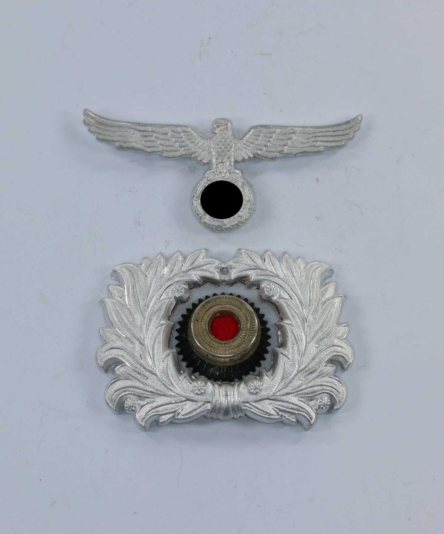 Eagle, Oakleaf wreath and Cockade. The eagle and wreath made of aluminium and all in a very good, slightly worn condition. The prongs complete and undamaged.